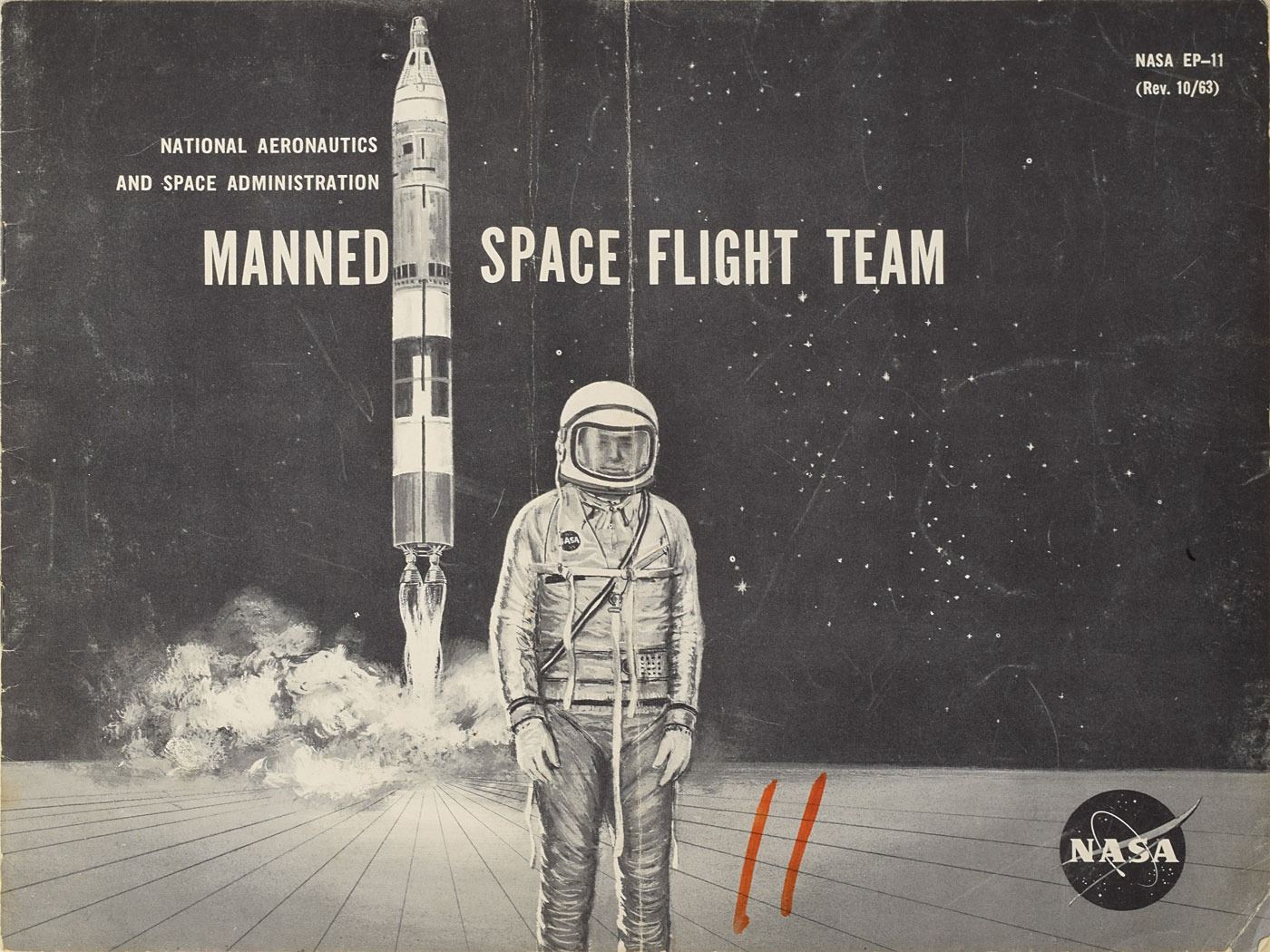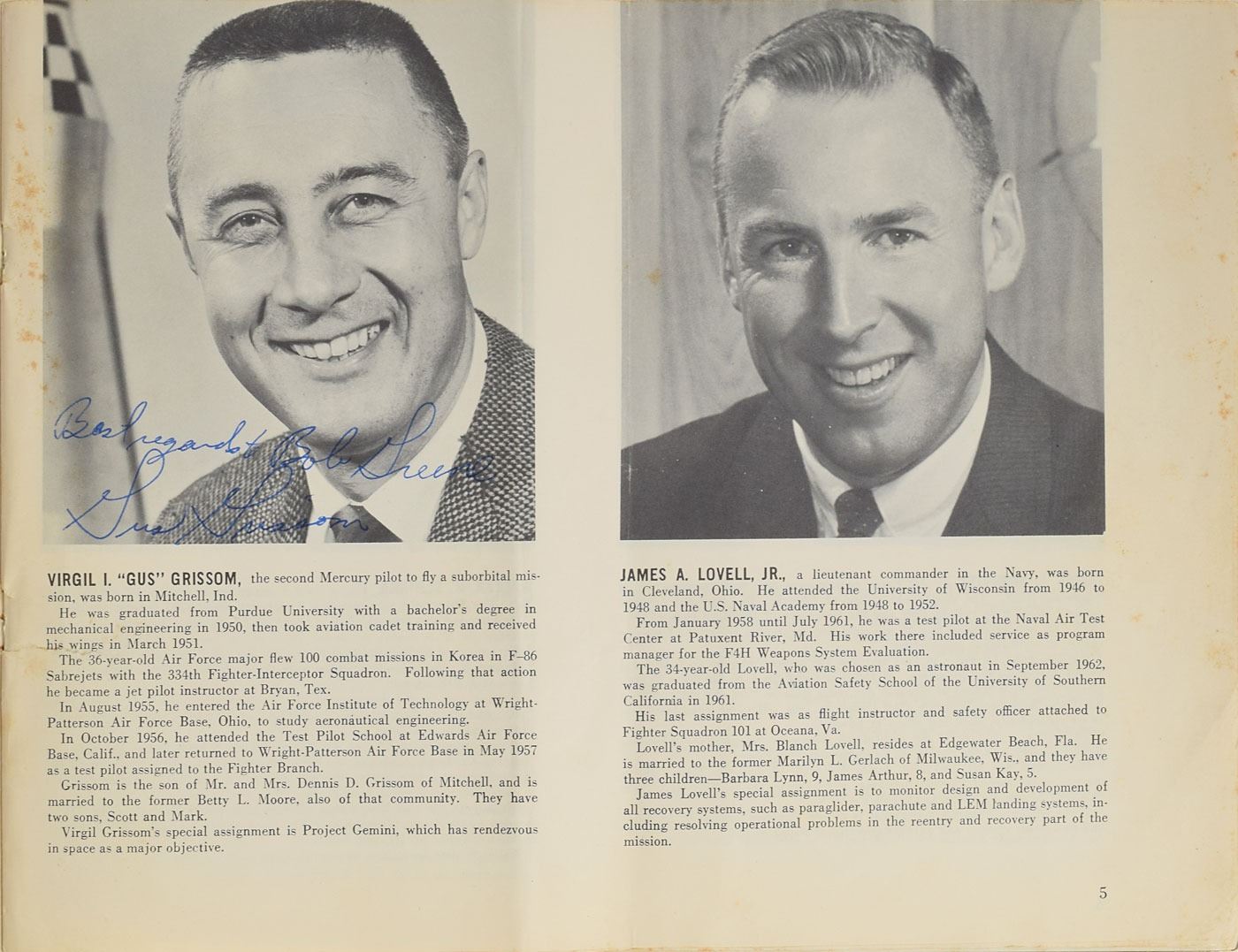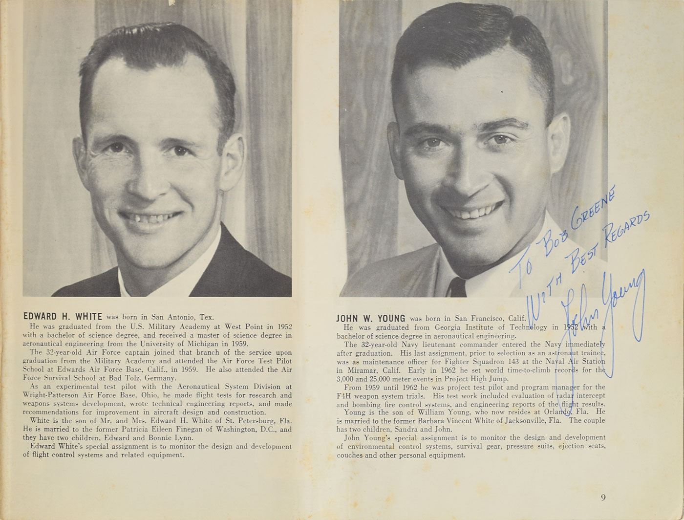 Vintage NASA booklet entitled "Manned Space Flight Team," thirteen pages, 10.25 x 7.75, signed and inscribed on page five in blue ballpoint, "Best regards to Bob Greene, Gus Grissom," and signed and inscribed on page nine in blue ballpoint, "To Bob Greene, with best regards, John Young." The booklet showcases images and biographical information for Astronaut Groups 1 and 2, with the very last page showing a group photo of Astronaut Group 3. In very good condition, with scattered light foxing, handling wear, and two heavy vertical folds.