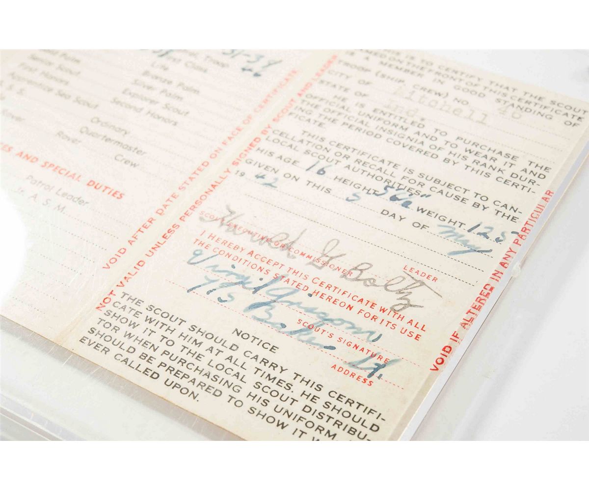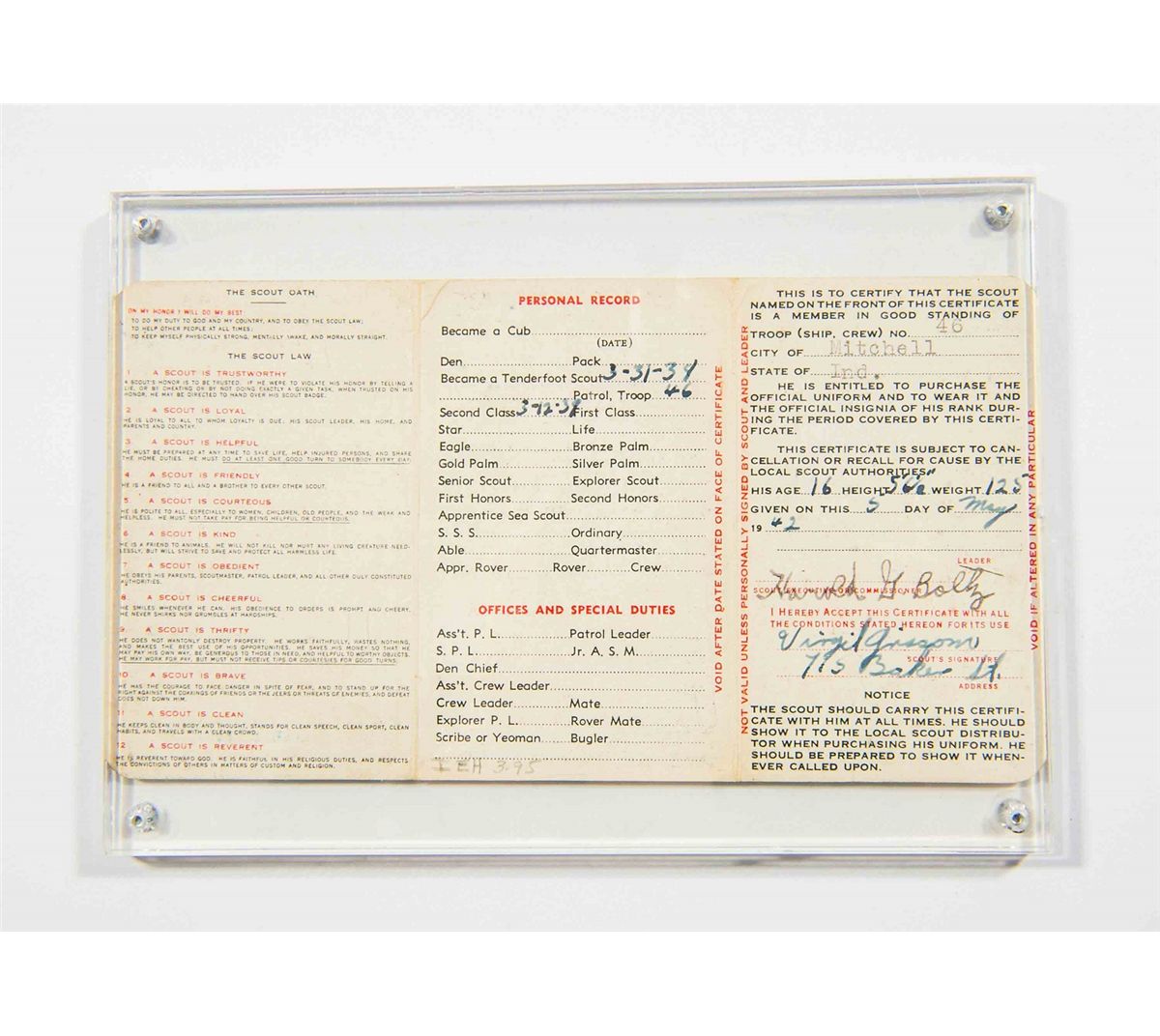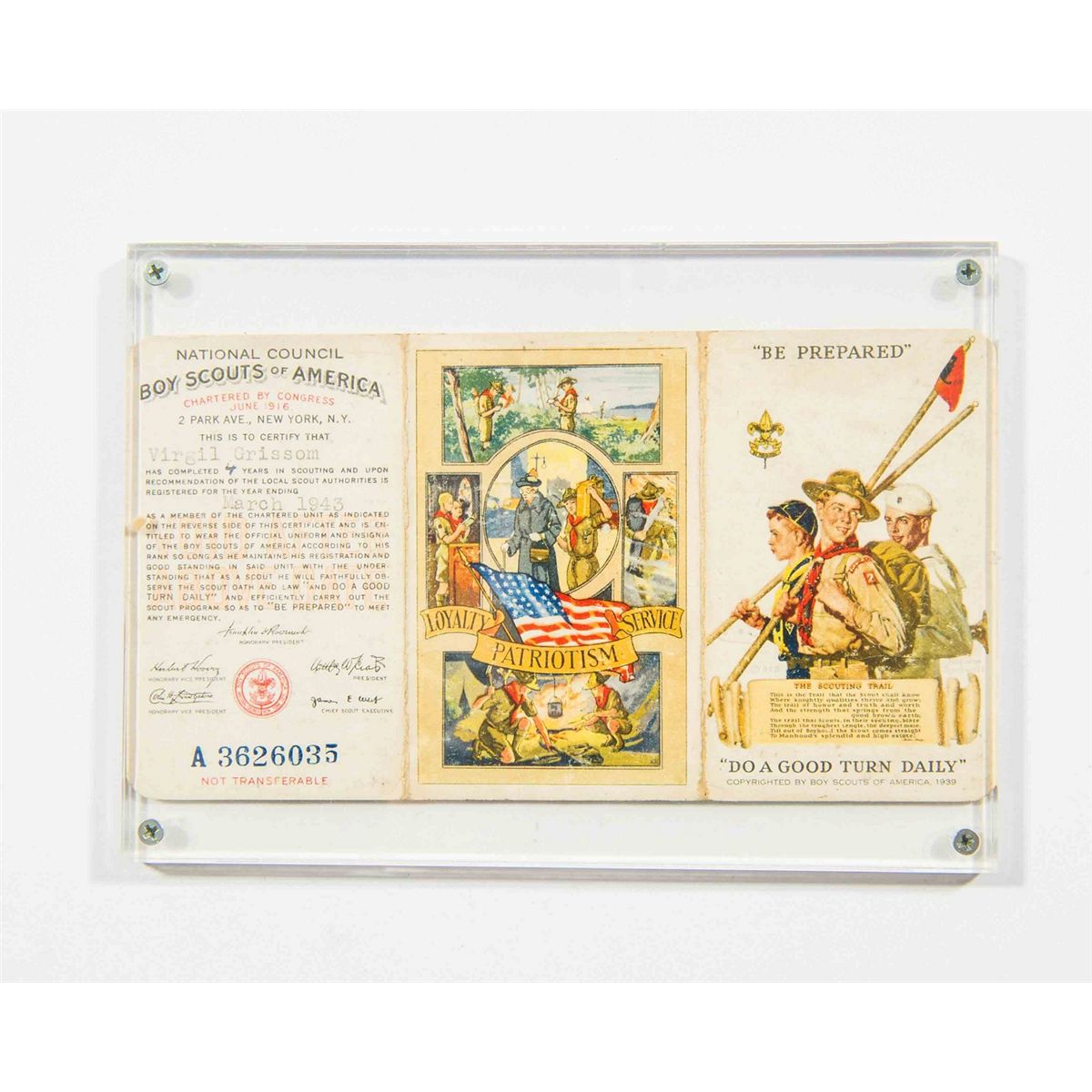 Original Mercury, Gemini, and Apollo astronaut Gus Grissom’s personal Boy Scouts of America membership card, unfolded to a size of 7 x 3.75, May 5, 1942, filled out in type and in his own hand, signed inside in fountain pen, “Virgil Grissom, 715 Baker St.” Grissom also lists his age as “16,” height as “5´ 6.5?,” weight as “125,” along with the date. He also fills out the dates he attained two different ranks within the Boy Scouts, as well as his troop number. His troop information is also typed, placing him in Troop 46 in Mitchell, Indiana. In fine condition. The front of this graphically stunning official card is printed with an illustration of various scouting deeds behind a banner that reads, “Loyalty, Patriotism, Service”—certainly three of the most important traits for any NASA astronaut. A one-of-a-kind item from Grissom’s youth, directly related to an organization that helped to establish the values that he and many other astronauts—most notably Neil Armstrong—held dear. This movingly personal Gus Grissom relic reminds us of the ideals of the tragic Apollo 1 fire victim and merits serious consideration from an accomplished collector.