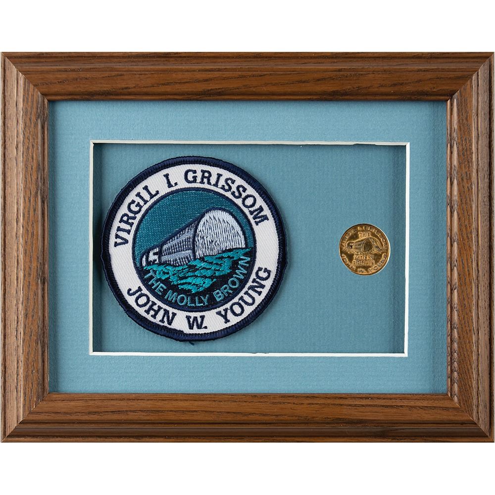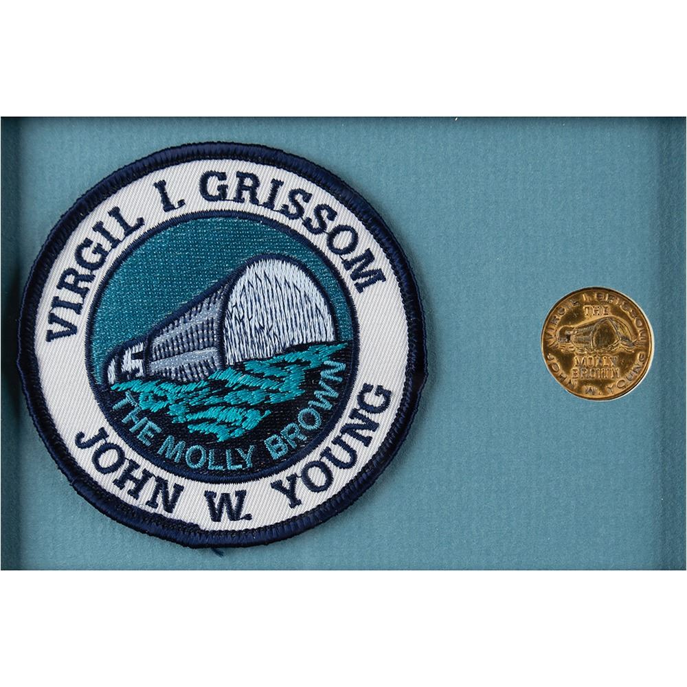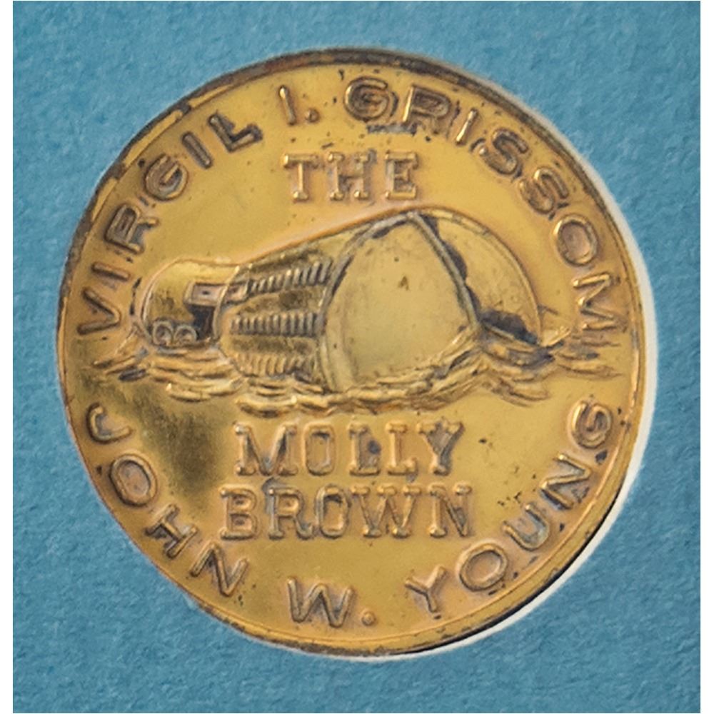 Gus Grissom's flown Gemini 3 gold-plated sterling silver Fliteline medallion, 1" in diameter, with the front depicting the GT-3 capsule ("The Molly Brown") floating in the ocean, encircled by the names of the astronauts, "Virgil I. Grissom" and "John W. Young"; the reverse features the name of the mission in raised text, "GT-3," and is engraved with its date, "March 23, 1965." Matted and framed with a Gemini 3 mission patch to an overall size of 9.5 x 7.5; window backing shows the reverse of medallion. In fine condition. Accompanied by a handwritten and flight-certified letter of authenticity from Grissom's wife, Betty: "I certify that this medallion flew aboard GT-3 with Virgil I. (Gus) Grissom. March 23, 1965." In fine condition.