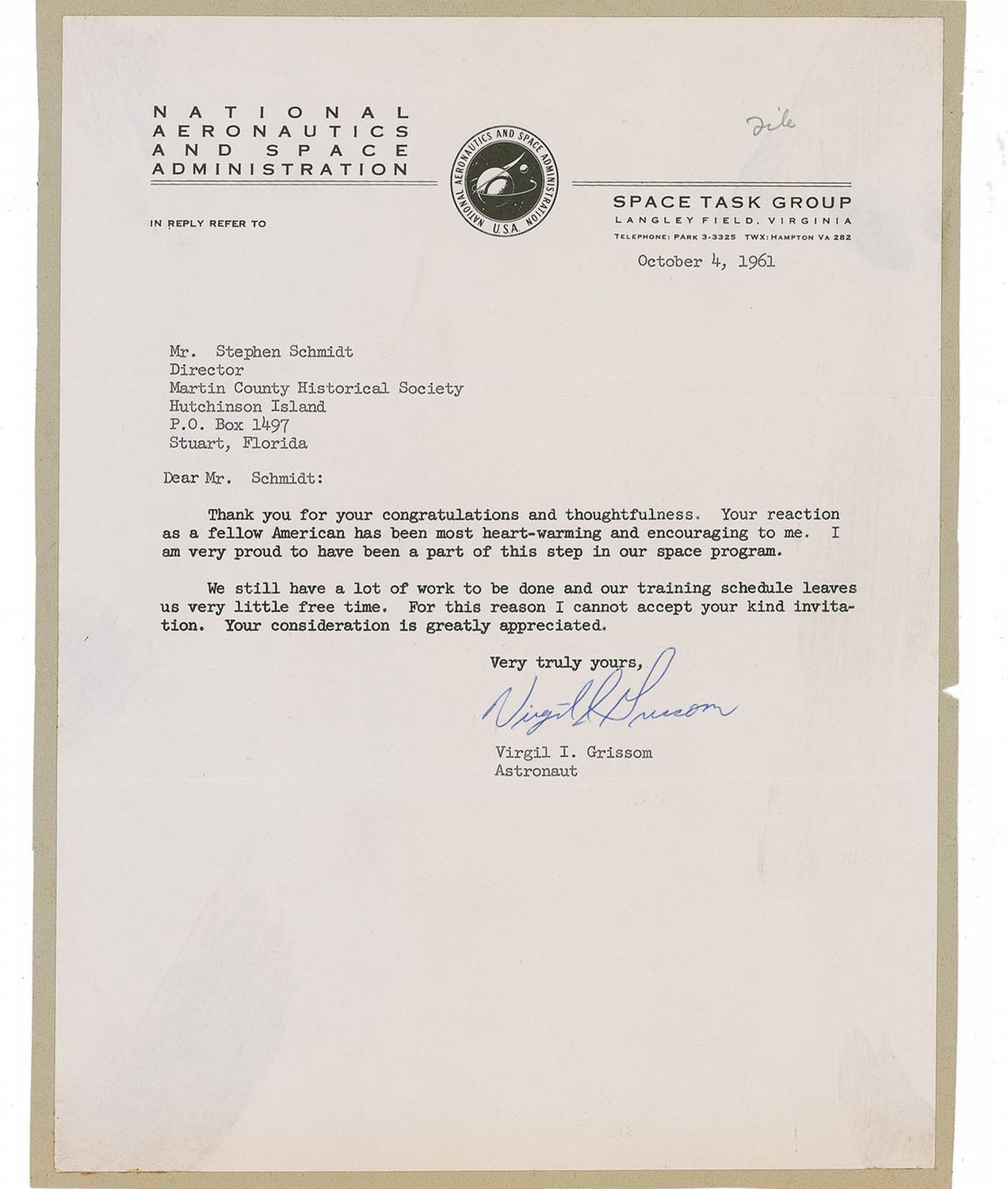 Vintage TLS signed with his full signature “Virgil I. Grissom,” one page, 8 x 10.5, NASA letterhead, October 4, 1961. A form letter of thanks to a member of the Martin County Florida Historical Society. In full: “Thank you for your congratulations and thoughtfulness. Your reaction as a fellow American has been most heart-warming and encouraging to me. I am very proud to have been a part of this step in our space program. We still have a lot of work to be done and our training schedule leaves us very little free time. For this reason I cannot accept your kind invitation. Your consideration is greatly appreciated.” Letter is affixed to a slightly larger sheet. A desirable ‘full signature’ of the third man in space.