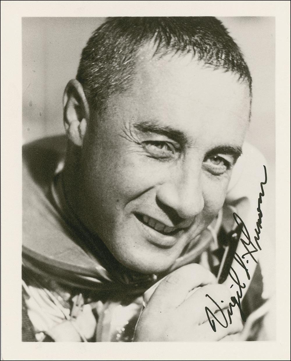 Mercury astronaut (1926–1967) who perished in the Apollo 1 flash fire. Vintage matte-finish 4 x 5 photo of Grissom in his spacesuit, boldly signed in fountain pen “Virgil I. Grissom.” In fine condition.
