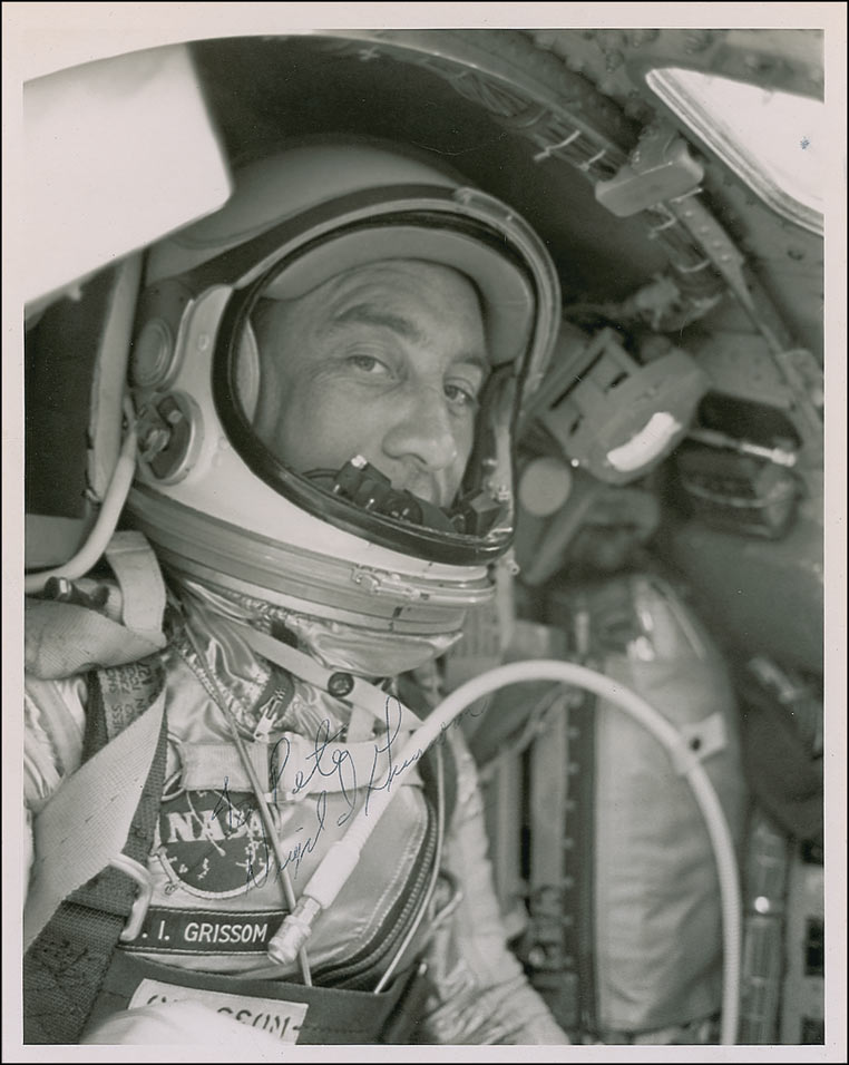 Vintage glossy 8 x 10 NASA photo of Grissom checking out a panel in his spacecraft before his Mercury launch, signed and inscribed in black ballpoint “To Peter, Virgil I. Grissom.” A few scattered light creases and surface marks, a hint of trivial silvering, and some slight contrast to signature and inscription, otherwise fine condition.