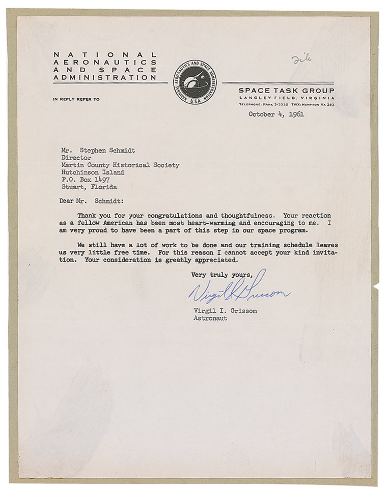 TLS, signed with his full signature “Virgil I. Grissom,” one page, 8 x 10.5, NASA letterhead, October 4, 1961. A form letter of thanks to a member of the Martin County Florida Historical Society. In full: “Thank you for your congratulations and thoughtfulness. Your reaction as a fellow American has been most heart-warming and encouraging to me. I am very proud to have been a part of this step in our space program. We still have a lot of work to be done and our training schedule leaves us very little free time. For this reason I cannot accept your kind invitation. Your consideration is greatly appreciated.” Letter is affixed to a slightly larger sheet.