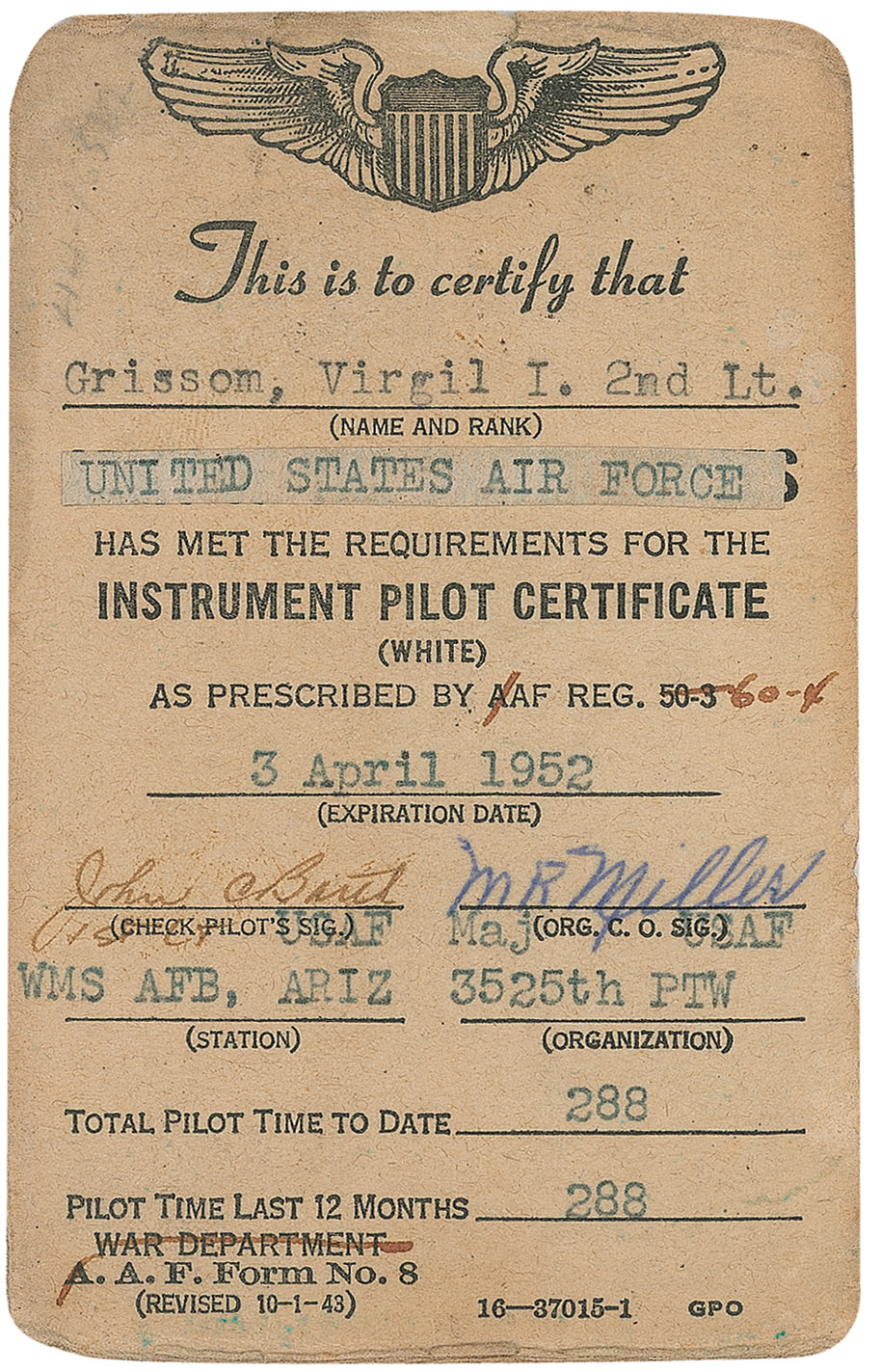 Instrument pilot certificate card, 2.5 x 4, issued to Air Force 2nd Lt. Virgil I. Grissom on April 3, 1952. In part, “This is to certify that 'Grissom, Virgil L. 2nd Lt.' United States Air Force Has Met the Requirements for the INSTRUMENT PILOT CERTIFICATE (White) as Prescribed by AF Reg. 60-4. '3 April 1952.” It is signed by John A. Baret and M R Miller for the Air Force. It shows that Grissom was in the 3525th Pilot Training Wing stationed at Williams Air Force Base in Arizona with 288 hours of pilot time to date. In very good condition with rounded corners, toning, and expected wear.