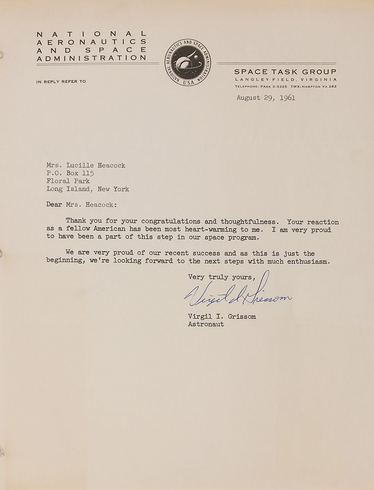 TLS signed “Virgil I. Grissom,” one page, 8 x 10.5, NASA Space Task Group letterhead, August 29, 1961. Letter to an admirer. In full: “Thank you for your congratulations and thoughtfulness. Your reaction as a fellow American has been most heart-warming to me. I am very proud to have been a part of this step in our space program. We are very proud of our recent success and as this is just the beginning, we’re looking forward to the next steps with much enthusiasm.” Light scattered creases, various blocks of toning, and binder dings to the left edge, otherwise fine condition.