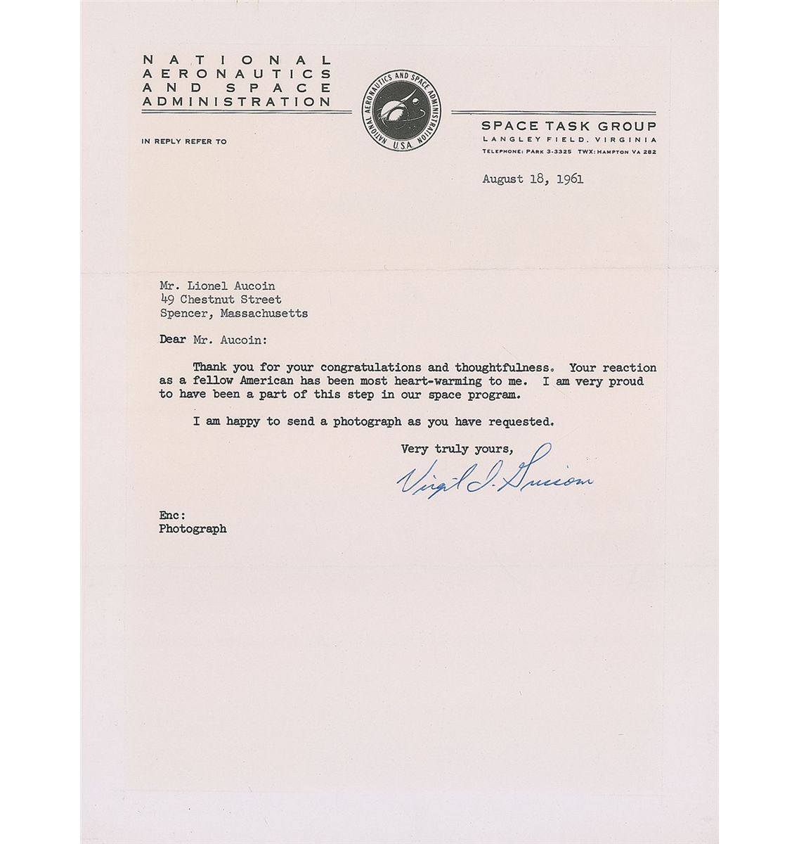 TLS signed “Virgil I. Grissom,” one page, 8 x 10.5, NASA Space Task Group letterhead, August 29, 1961. Letter to an admirer. In full: “Thank you for your congratulations and thoughtfulness. Your reaction as a fellow American has been most heart-warming to me. I am very proud to have been a part of this step in our space program.” In fine condition.