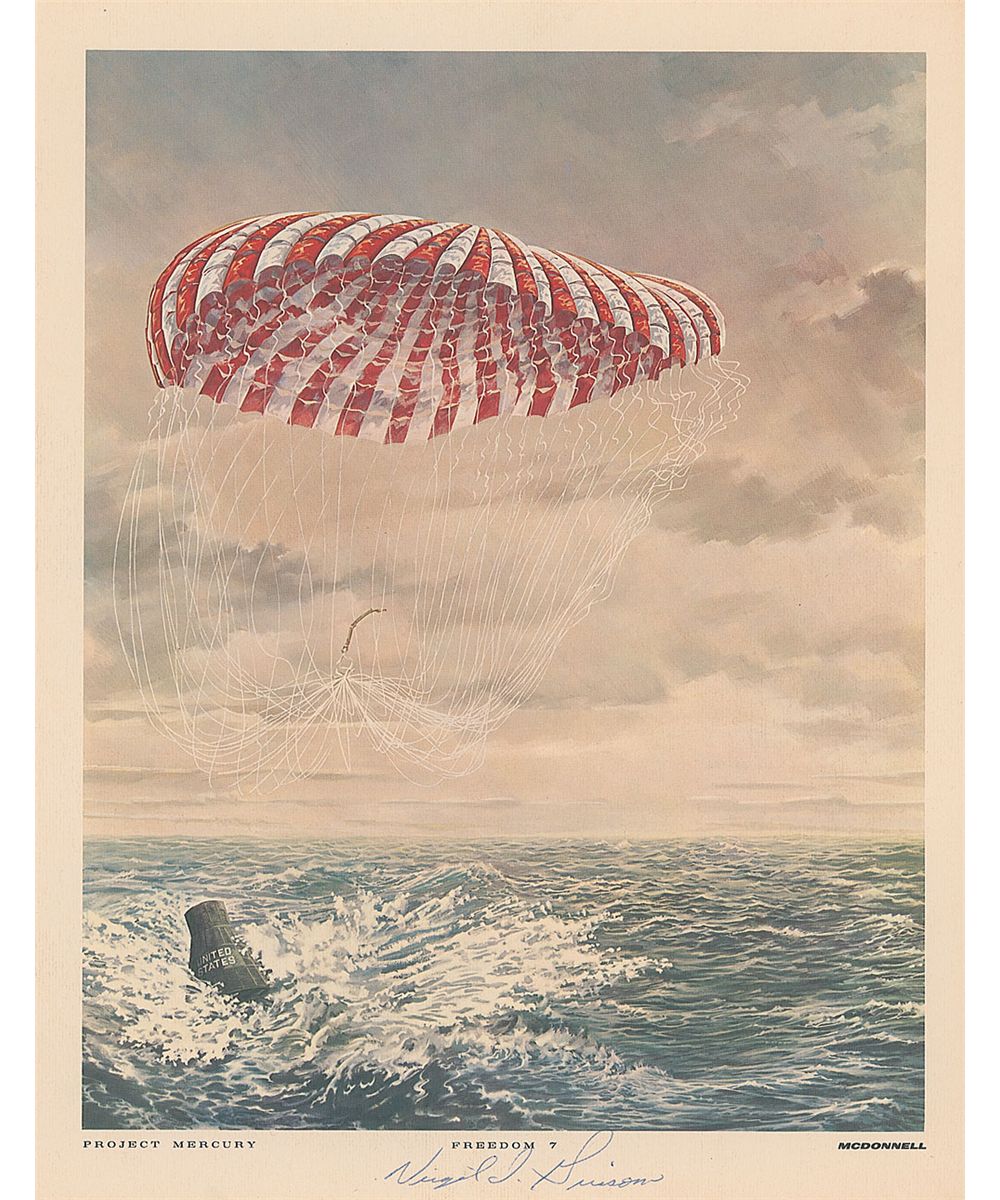 Color 11 x 14 print of Grissom’s Freedom 7 capsule splashing down, made by McDonnell, signed in the lower border in blue ballpoint, “Virgil I. Grissom.” In fine condition.