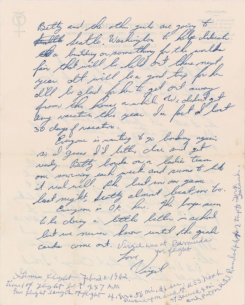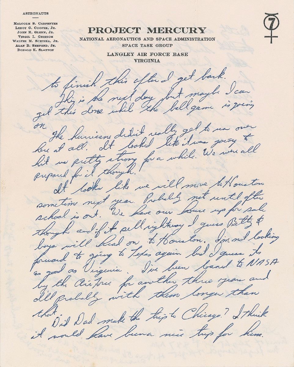 Everyone is wanting to go bowling again so I guess I’d better close and get ready. Betty bowls on a ladies team one morning each week and seems to like it real well. She beat me one game last night, Scotty almost beat me too. Everyone is OK here. The boys seem to be doing a little better in school but we never know until the grades come out.” At the conclusion are several handwritten notations, presumably by Grissom’s mother which read, “Virgil was at Bermuda for flight. Glenn’s flight Feb. 20, 1962. Time of flight left 9.47 a.m. His flight length of flight 4 hrs 56 mi. 26 sec. Picked up on deck of USS Noah at 3 o’clock 4 mi. and put on USS Randolph for trip to Island.” In fine condition, with intersecting mailing folds, and a few moisture spots to reverse of first page, not affecting legibility. Accompanied by the original mailing envelope addressed in Grissom’s hand.