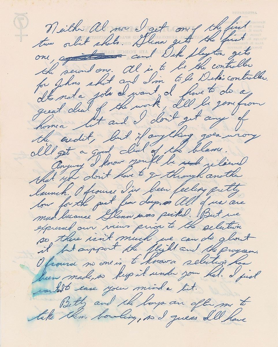 Anyway I know you’ll be relieved that you don’t have to go through another launch. Of course I’ve been feeling pretty low for the past few days. All of us are mad because Glenn was picked. But we expressed our views prior to the selection so there isn’t much we can do about it but support the flight and the program. Of course no one is to know a selection has been made, so keep it under your hat. I just wanted to ease your mind a bit.