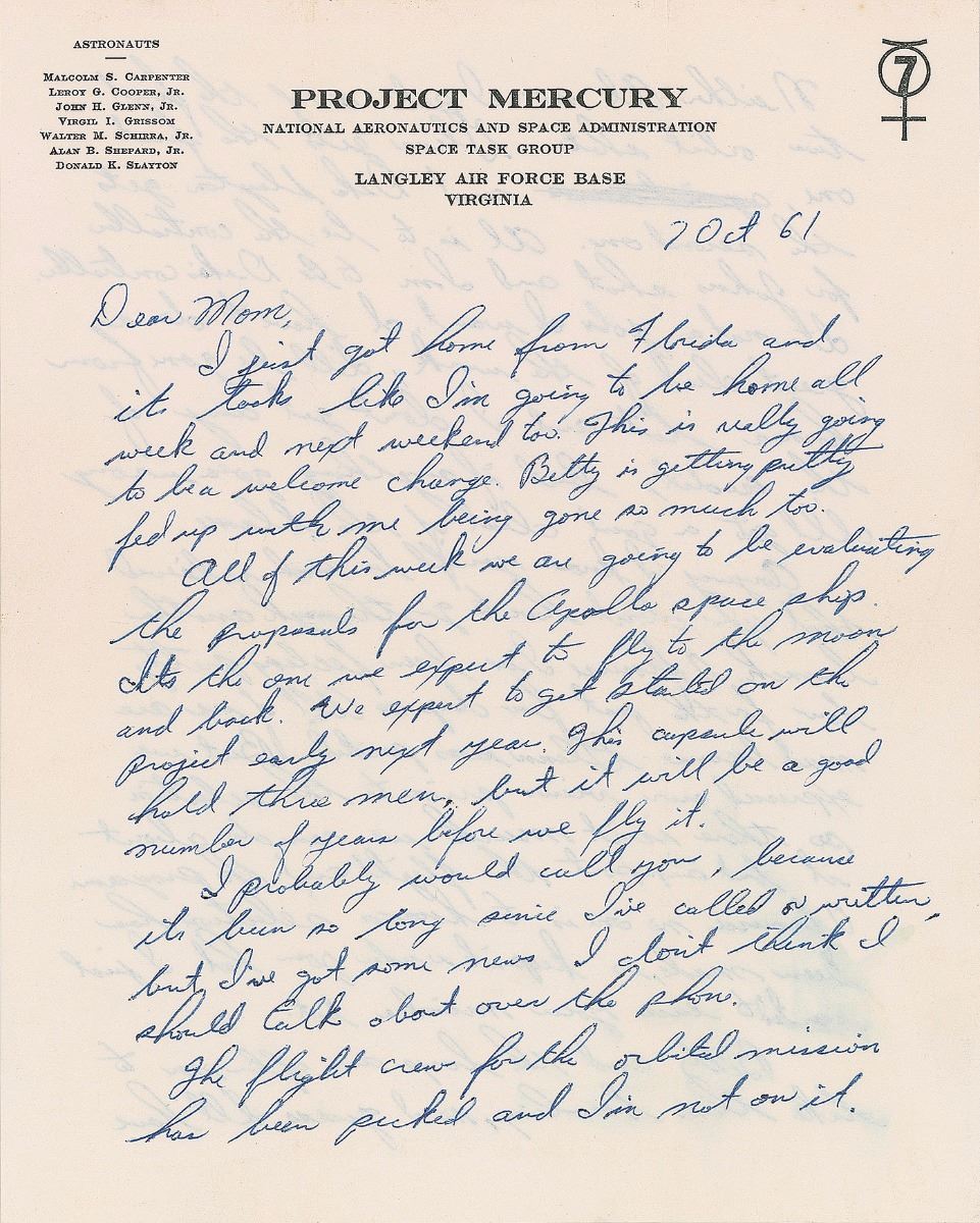 ALS signed “Virgil,” two pages both sides, 7.75 x 10, Project Mercury letterhead, October 7, 1961. Letter to his mother. In full: “I just got home from Florida and it looks like I’m going to be home all week and next weekend too. This is really going to be a welcome change. Betty is getting pretty fed up with me being gone so much too.