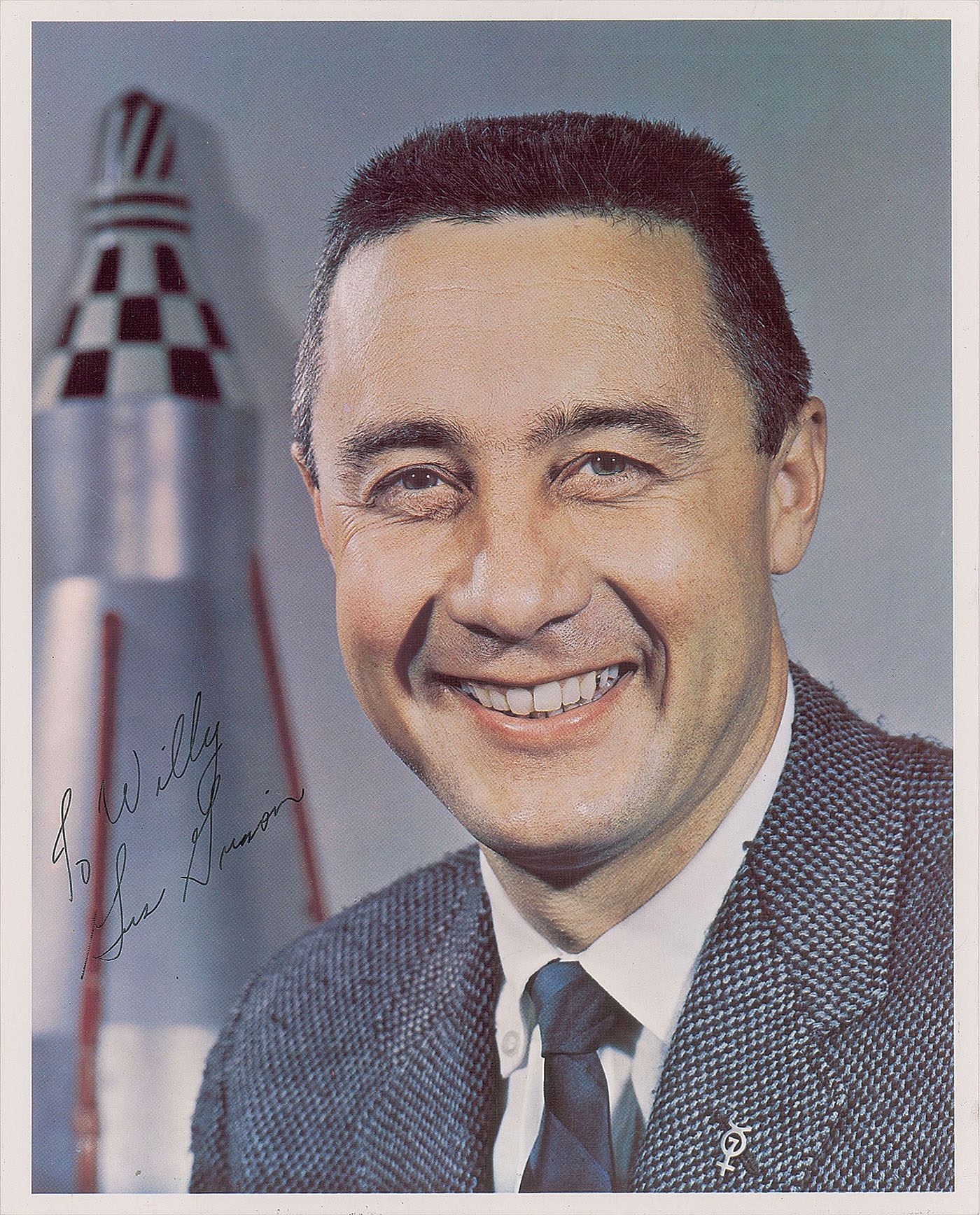 Official color 8 x 10 NASA lithograph of Grissom wearing a Mercury 7 lapel pin, signed and inscribed in black ink, "To Willy, Gus Grissom.” In fine condition, with a few light creases and a paperclip impression to top edge.