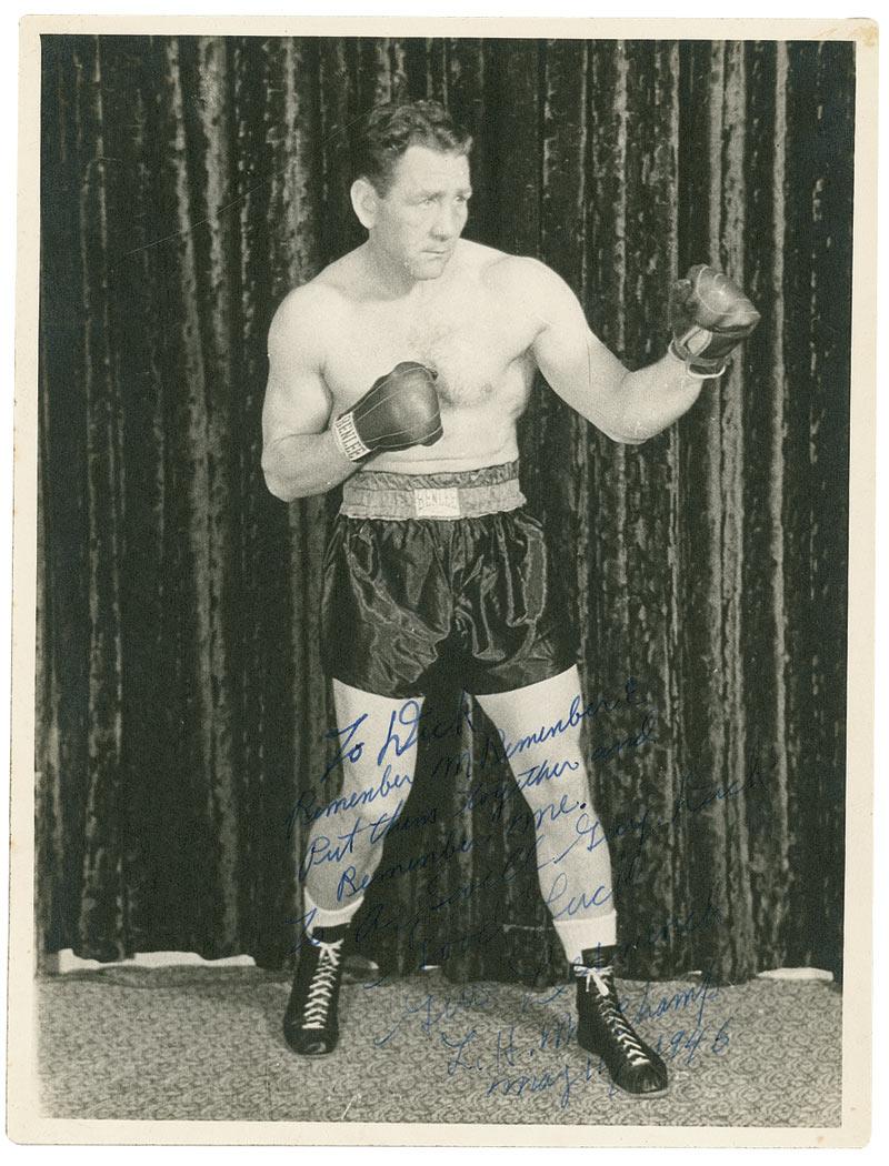 Boxer (1915–1964) who held the world light heavyweight title from 1941 to 1948. Vintage 6.5 x 8.5 matte-finish photo, signed and inscribed in fountain pen “To Dick. Remember M Remember E. Put them together and Remember me. To A Swell Guy Dick, Good Luck, Gus Lesnevich. L. H. W. Champ May 11, 1946.” In fine condition, with light bend, scattered silvering to the darker areas, and fair contrast to some of the words against their dark background.