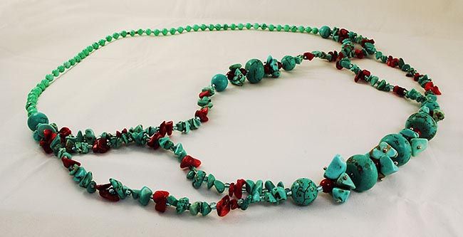 Gushing Sky Blue Turquoise 556.00ctw Beads Necklace **|**|** 32 Inches Long Trendy Style Crafted by Hand 3 Row Turquoise and Red Coral Beads in Myriad Shapes and Sizes. ; MSRP: $100