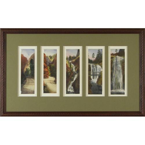 Gustaf Sandahl (1878-1928) Set of all 5 Hand Colored Photographs from the "Views Of South Cheyenne Canon" Series, "Pillars of Hercules", "Cheyenne Gorge", "Seven Falls", "Ramona Falls" & "Bridal Veil Falls", 7 1/2" x 2 1/4" each, framed together, 3 studio labels attached