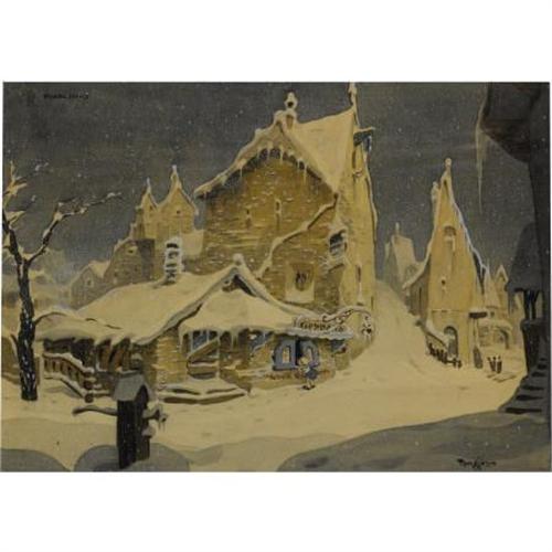 <B>Gustaf Tenggren - "Pinocchio" Geppetto's Store Front Concept Illustration Original Art (Disney, 1940).</B></I> A light snow falls on this indelible image of Geppetto's store front by Gustaf Tenggren. Attractively matted and framed, this beautiful watercolor concept illustration has an image area of approximately 14" x 10". In Excellent condition and signed by Gustaf Tenggren at the bottom right.<BR><BR><b>Shipping:</b> Framed - with Glass, Medium (<a target="_blank" href="http://www.heritageauctions.com/common/shipping.php">view shipping information</a>)