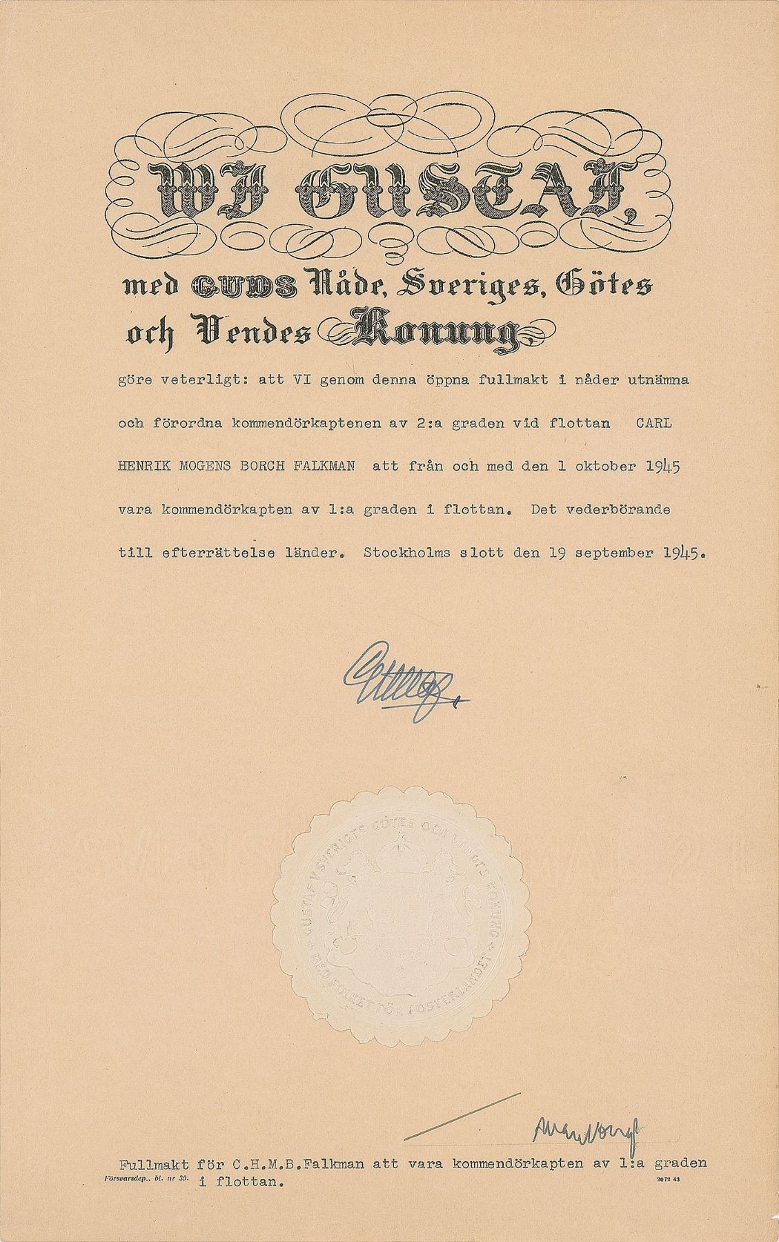 DS in Swedish, one page, 8.75 x 14, September 19, 1945. Untranslated document issuing power of attorney for C. H. M. Falkman to be the commander of the 1st grade in the navy. Signed in black ink by Gustaf V, penned neatly above the original white wafer seal. In fine condition.