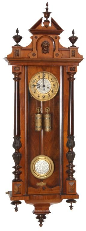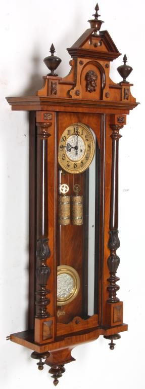 Gustav Becker 2 Weight Vienna Regulator. 7 in. gilt brass dial has a repousse filigree design in the center with black pierced hands and incised hour numbers; brass weight driven movement with half hour strike on a coiled gong, has brass pulleys and fancy repousse gilt brass weights, pendulum has a long walnut stick with 2 tone filigree decorated bob. In a carved walnut case having a broken pediment crest with rosettes, maidens head and turned finials, turned half columns on the door and teardrop finials at the bottom. Good overall condition. 55 in. high x 18 in. wide x 7.25 in. deep.