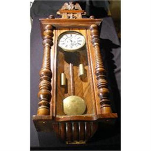 Many more photographs are available. The clock has an 8.1/2" enamel face with pretty hands. The works are signed with a circle carrying,"Gustav Becker Freiburg In Schl. around a crown topped anchor with the letter G.B." Another circle carrying "Medaille D'or." Also marked with "P64" and "1872806" It has plain brass weights (2) and a plain brass pendulum. There are no marks on either of these.The case has an eagle top that is missing its beak and has a slit in one wing. The two decorative finials that went each side are missing. There is a piece of veneer missing from the bottom of the door and also from where the door closes onto the base. There is glass on each side of the case. The door has two fully carved columns, one each side. The bottom decoration is missing as are the two finials that went each side of the bottom. There is a key. The key fits and the clock will wind. I have not given it more than one turn each side as I do not know how to connect the weights to the wires etc. Also I have no idea how to connect the pendulum. Bought from a Denver estate and sold as is.