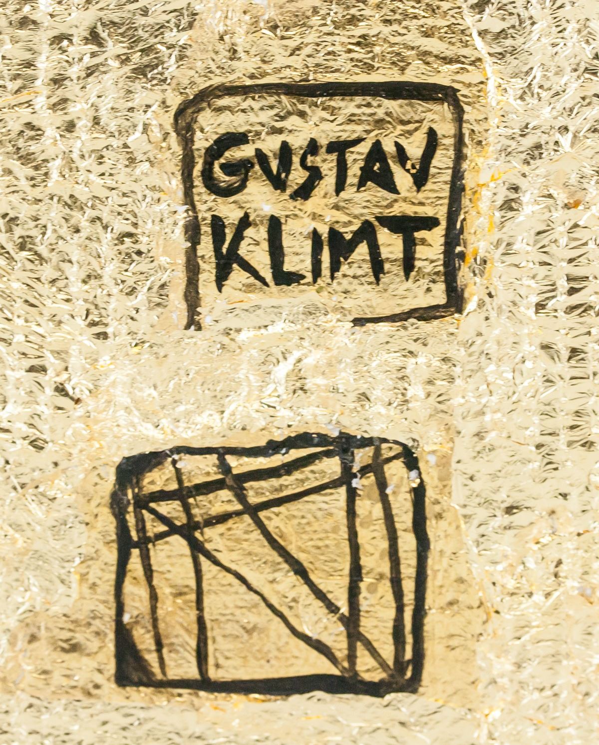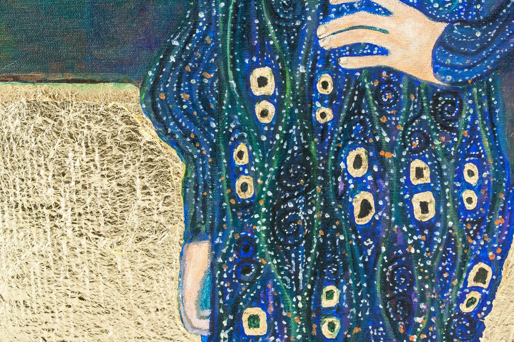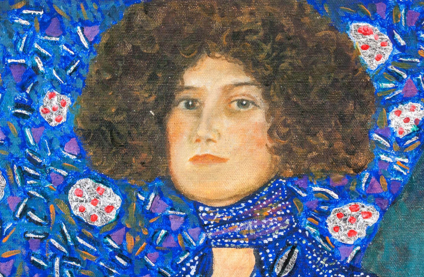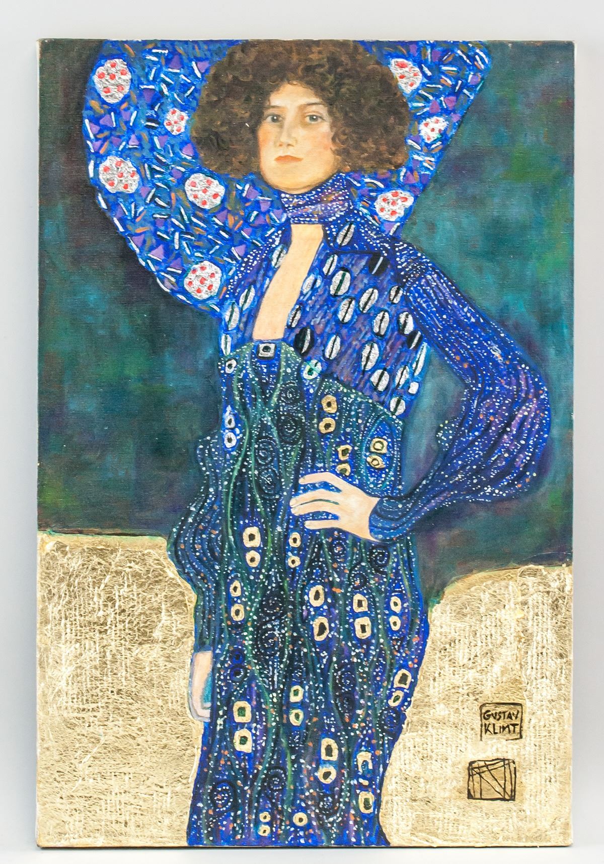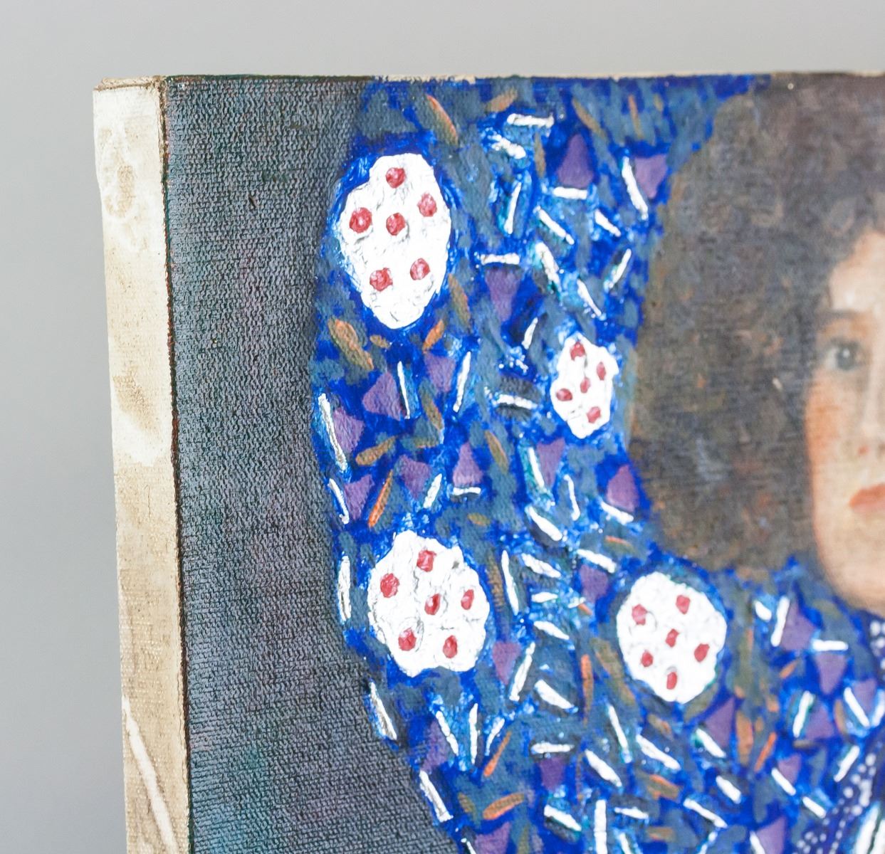 Oil on canvas. Featuring portrait of woman in a blue gown. Signed "Gustav Klimt" in the bottom right corner. Stamped illegibily on verso. Attributed to Gustav Klimt (1862-1918, Austrian). 60.5 x 40 cm (24 x 15.75 inches).