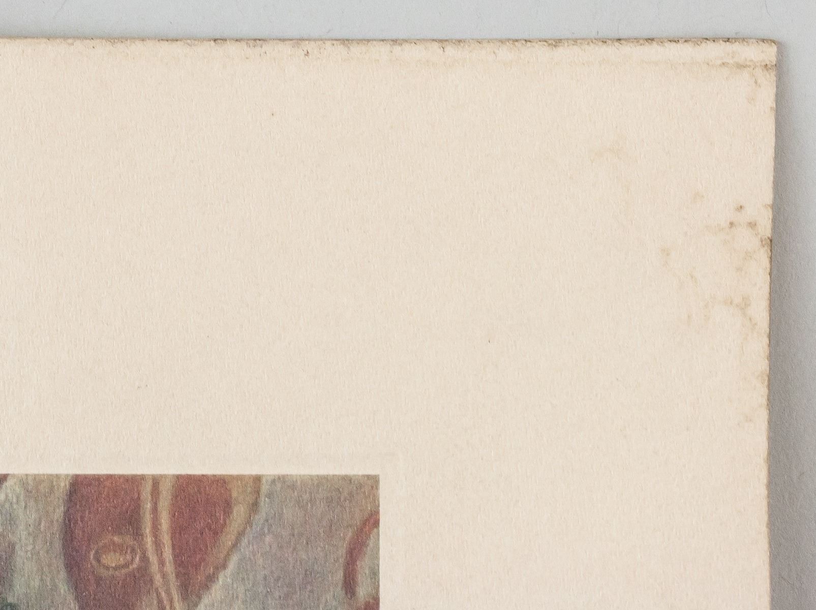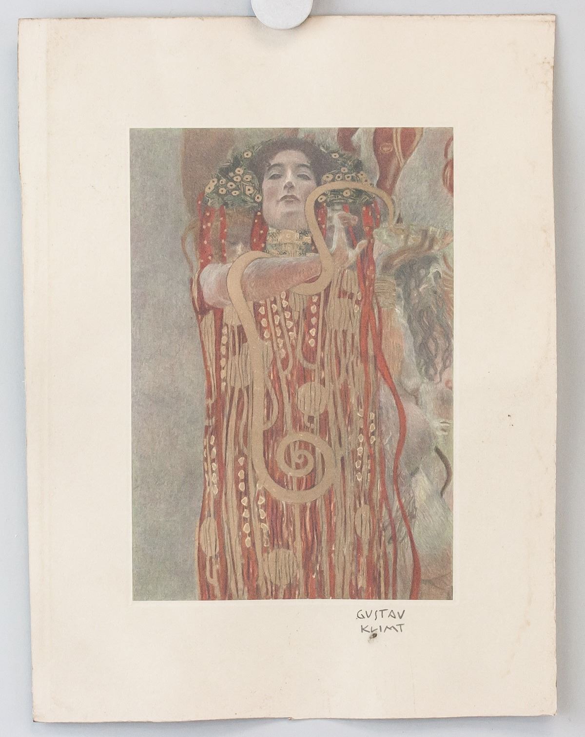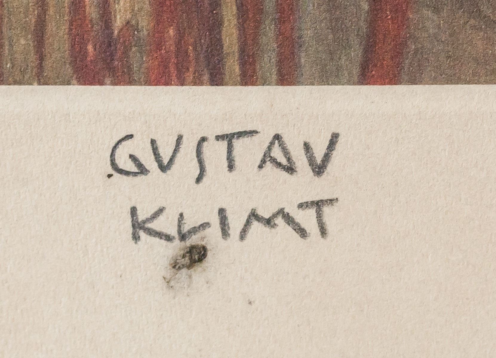Linocut on paper. Featuring a woman dressed in red and gold. Signed "GUSTAV KLIMT" beneath the bottom right corner of the image. Attributed to Gustav Klimt (1862-1918, Austrian). Plate size: 19 x 13 cm (7.5 x 5 inches). Paper size: 28 x 21 cm (11 x 8.25 inches). Provenance: This lot carries limited provenance from a Southern Ontario estate.