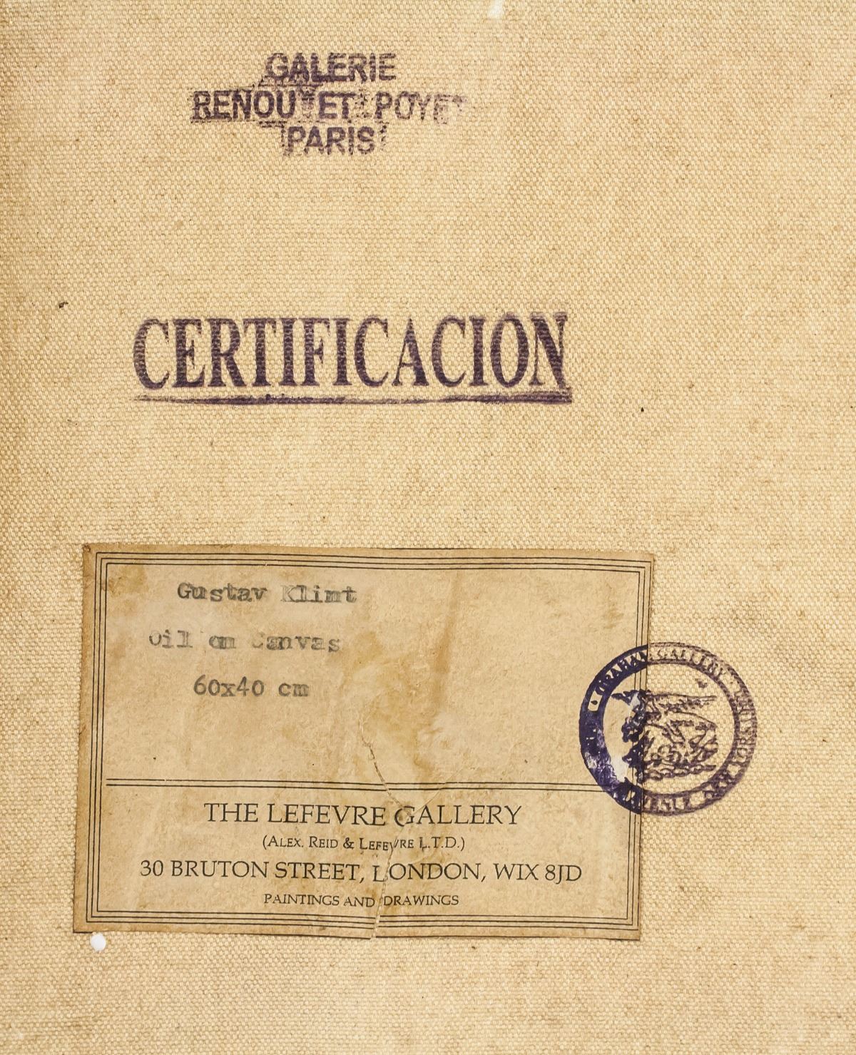 Oil on canvas, framed. Featuring a portrait of a woman. Signed GUSTAV KLIMT on the lower right corner. Label affixed to verso inscribed Gustav Klimt / oil on canvas 60x40cm / LEFEVRE GALLERY and stamped CERTIFICACION and GALERIE RENOU ET POYET PARIS. Attributed to Gustav Klimt (1862-1918, Austrian). Canvas size: 59 x 39 cm (23.5 x 15.5 inches). Frame size: 73 x 53 cm (29 x 21 inches)