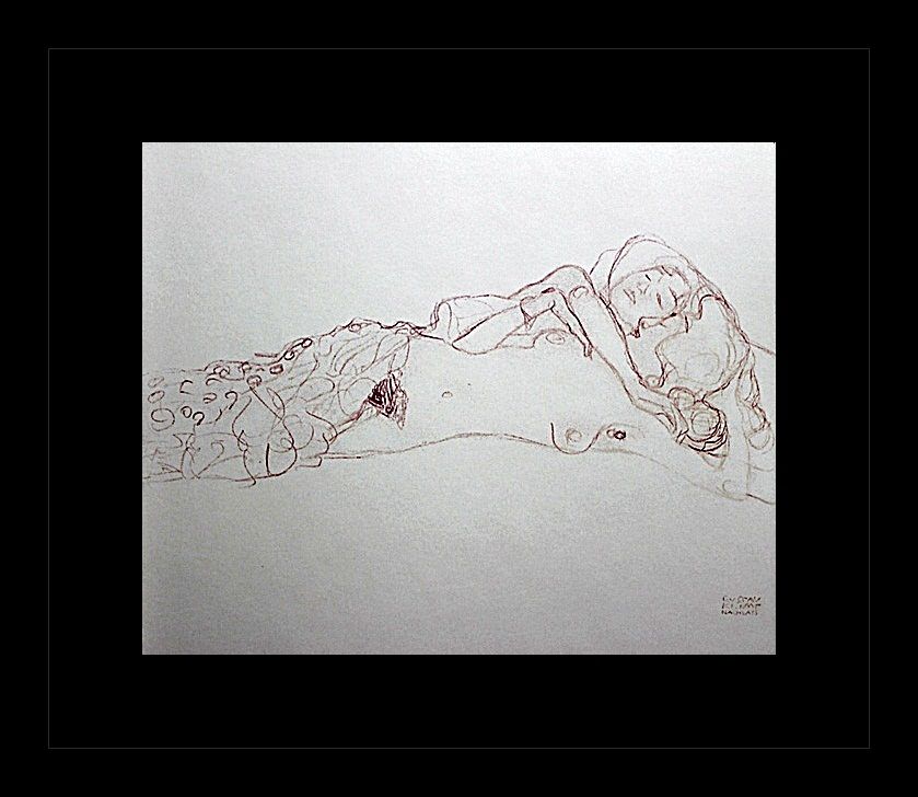 Erotic sketch lithograph by Gustav Klimt. Comes gallery framed black on black.