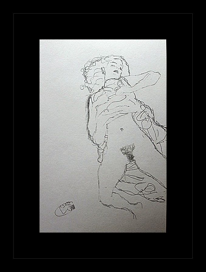Erotic sketch lithograph by Gustav Klimt. Comes gallery framed black on black.