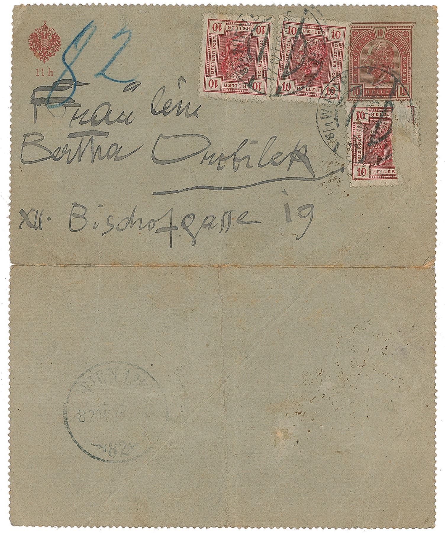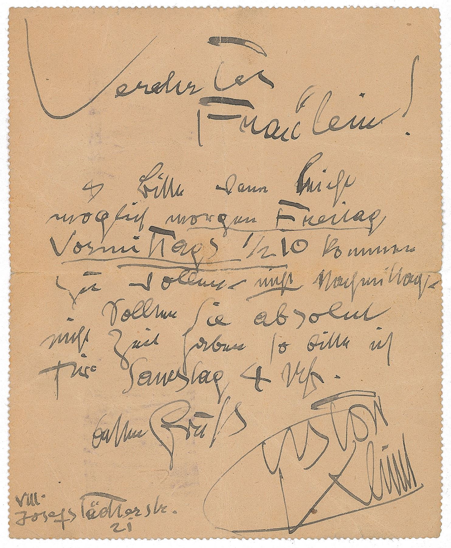 Austrian symbolist painter (1862–1918) who was one of the most prominent members of the Vienna Secession movement, best remembered for his 'golden phase' and such works as 'The Kiss' and 'Adele Bloch-Bauer I.' Beautiful ALS in German, one page, 5 x 6, no date. A visually striking untranslated letter, addressed on the reverse in Klimt's hand. In very good condition, with heavy overall creasing. A scarce and wonderful letter by the esteemed artist.