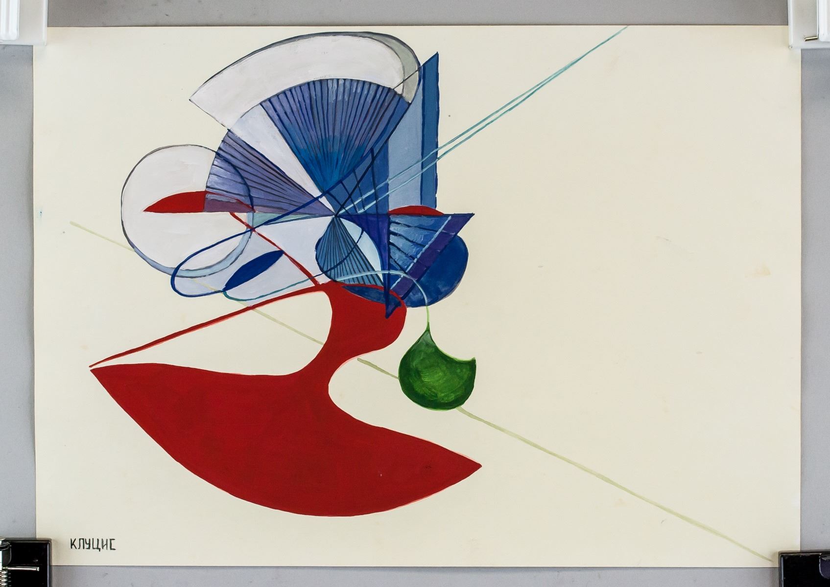 Gouache on paper. Featuring a constructivist composition. Signed Klutsis on the lower left corner. Attributed to Gustav Klutsis (1895-1938, Latvian). 20.5 x 29.5 cm (8 x 11.5 inches). PROVENANCE: Southern Ontario estate
