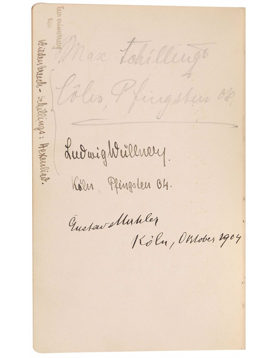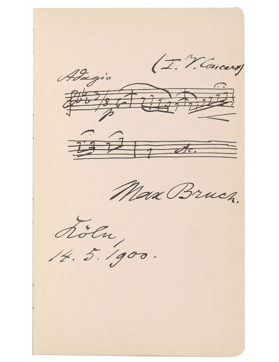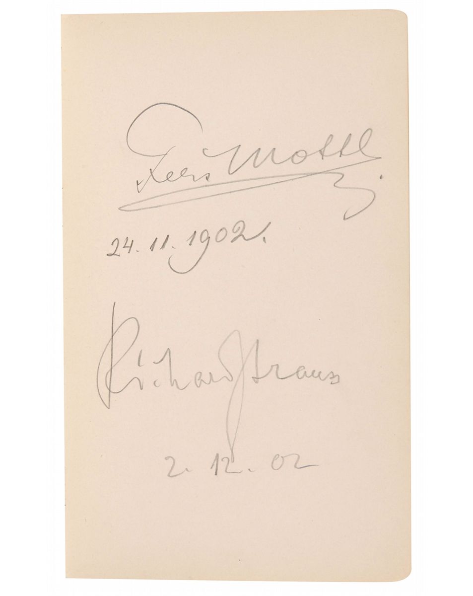 Exceptional leatherbound guest book once belonging to Victor Schnitzler and his wife Vika, 5 x 8, signed inside in ink and pencil by an extraordinary group of 21 musicians and composers, many adding AMQSs, including: Gustav Mahler, Max Bruch (AMQS), Richard Strauss, Edward Elgar, Joseph Joachim, Charles Halir, Robert Haussmann, Clotilde Kleeberg (AMQS), Jan Kubelik (AMQS), Ottilie Metzger-Lattermann, Felix Mottl, August von Othegraven, Ignacy Paderewski, Cacilie Rusche-Endorf, Pablo de Sarasate (AMQS), Xaver Scharwenka (AMQS), Max von Schillings, Fritz Steinbach (AMQS), Felix Weingartner (AMQS), Emanuel Wirth, and Ludwig Wullner. Additional signers include Walter Petersen and Wilhelm Lehmbruck, both drawing pencil portrait sketches, and painter and etcher Felix Krause. Individual pages in fine to very fine condition, with a loose and cracked binding of the guest book itself. A positively marvelous assortment of classical music greats.