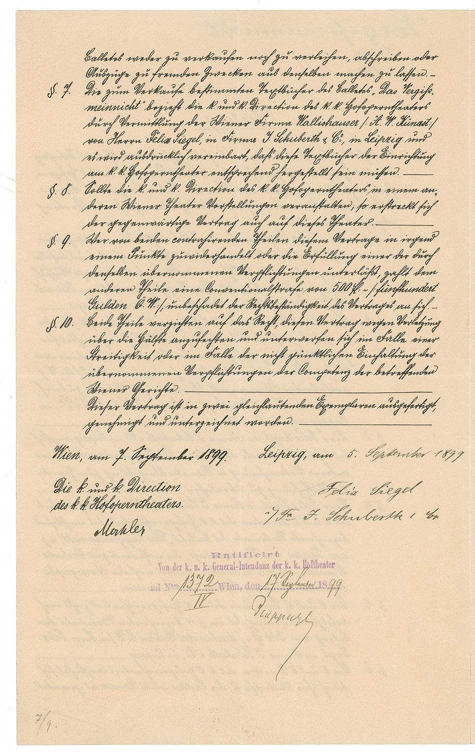 Austrian composer (1860–1911) whose epic symphonies redefined the genre and assured him a place among the most important and influential composers of the late 19th and early 20th centuries. Manuscript DS, in German, signed “Mahler,” one page both sides, 8.25 x 13.25, September 5, 1899. Crisply penned untranslated contract between the publishing house and the Vienna Court Opera concerning the print of the score and orchestra material for the first production of the ballet Vergissmeinnicht in Vienna, signed at the conclusion in black ink by Mahler. Central horizontal and vertical fold, a couple of pencil notations to top of first page, office stamp to bottom of second page, a bit of light soiling, and a diagonal crease to bottom of page, otherwise fine condition.