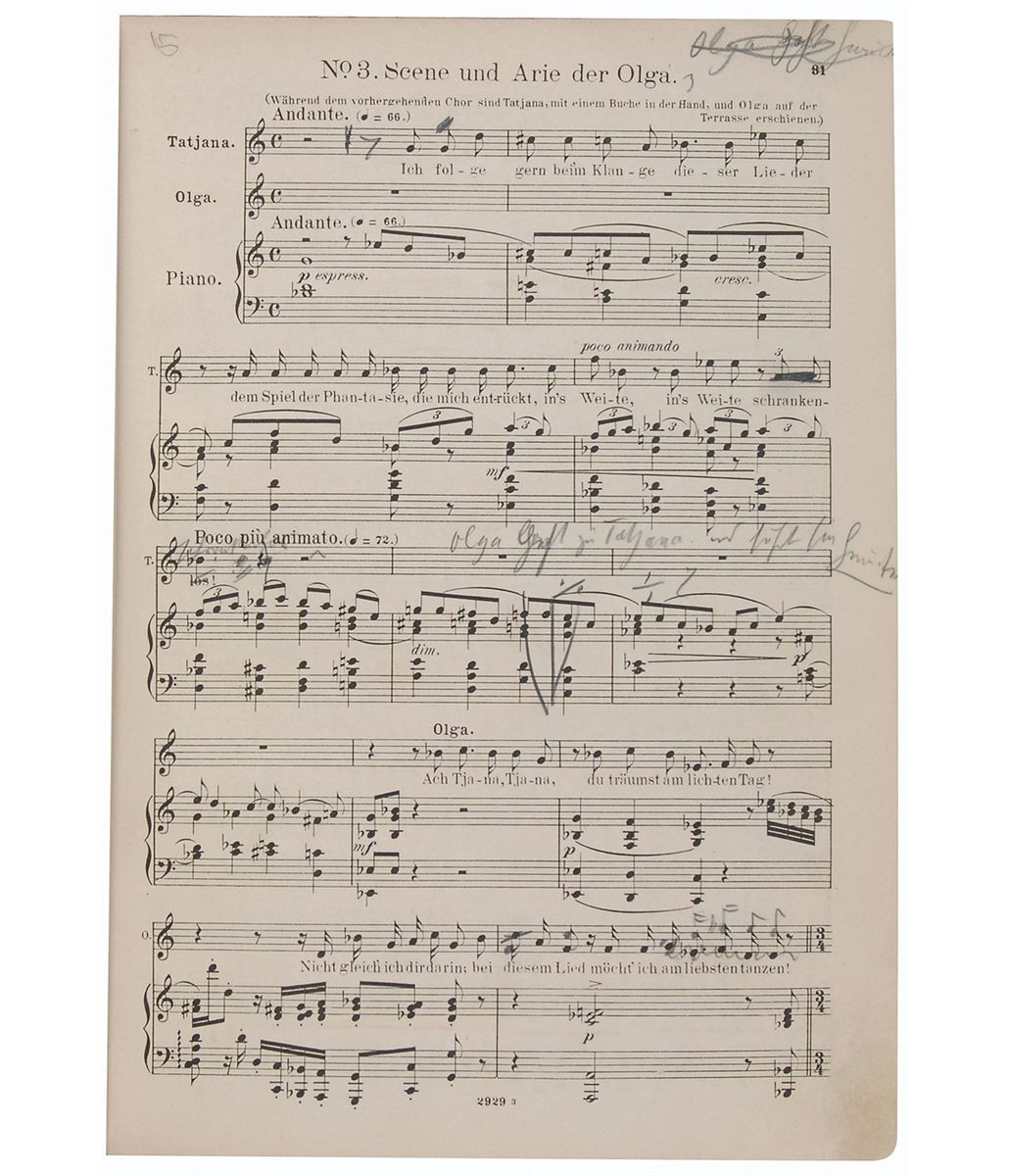 Prior to the Vienna premiere in which Mahler used this score, he had conducted its German debut in Hamburg on January 19, 1892, in the presence of Tchaikovsky himself. Showered with praise, Tchaikovsky attributed the terrific success of the production to Mahler, whom he described as 'not some average sort, but simply a genius burning with a desire to conduct.' The ultimate goal of Mahler's career was to obtain an appointment in Vienna, and he at last joined the Vienna Court Opera in May 1897 as a staff conductor and director-designate, pending confirmation of his appointment as director by the emperor, which he received in October. His production of Eugene Onegin came the following month, and it was performed a total of 20 times during his decade-long tenure with the company. This hand-edited score is a wonderful treasure of operatic history, representing one of Tchaikovsky's crowning achievements as well as an important moment in Mahler's conducting career.