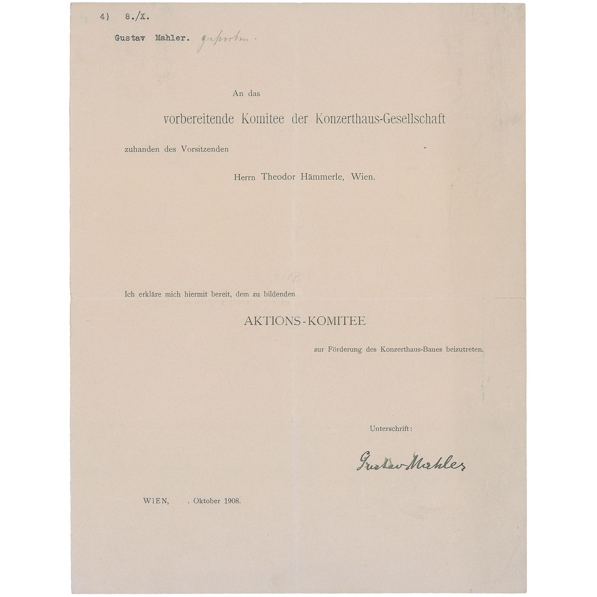 DS in German, one page, 9 x 11.5, October 1908. A music-related document sent to Theodor Hammerle, chairman of Vienna’s Konzerthaus Society, in which Mahler agrees to “join the action committee forming to promote the concert hall-building.” Intersecting folds with one small edge separation, overall wrinkling, and a bit of brushing to signature, otherwise fine condition. The construction of the Wiener Konzerthaus was started on December 9, 1911, and it first opened in 1913.
