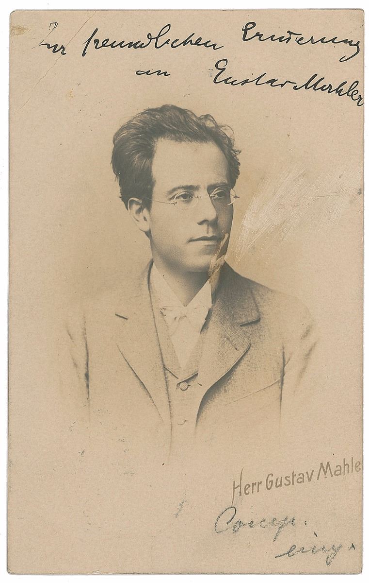 Handsome matte-finish 3.25 x 5.5 postcard photo of Mahler as a young man, signed and inscribed circa 1900 in German in black ink, “Zur freundlichen Erinnerung, an Gustav Mahler.” Postally used and addressed on the reverse in another hand. In very good condition, with a crease to the upper left corner, irregular surface marks or scuffing to his chin area and to the right of his face, and light soiling. A rare format boasting an especially bold signature.