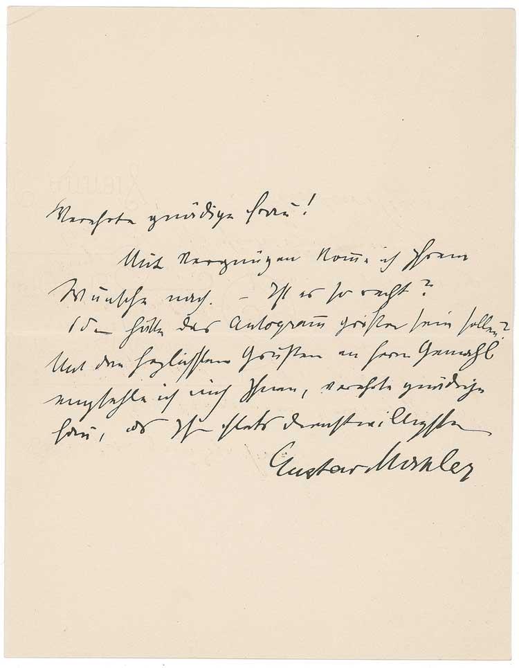 Austrian composer (1860–1911) whose epic symphonies redefined the genre and assured him a place among the most important and influential composers of the late 19th and early 20th centuries. ALS in German, one page, 5.25 x 6.75, no date. Letter to the wife of Viennese music critic Max Kalbeck in which he complies with her wish for an autograph. Accompanied by the original transmittal envelope, addressed in Mahler’s hand. In fine condition. Pre-certified John Reznikoff/PSA/DNA and RRAuction COA.