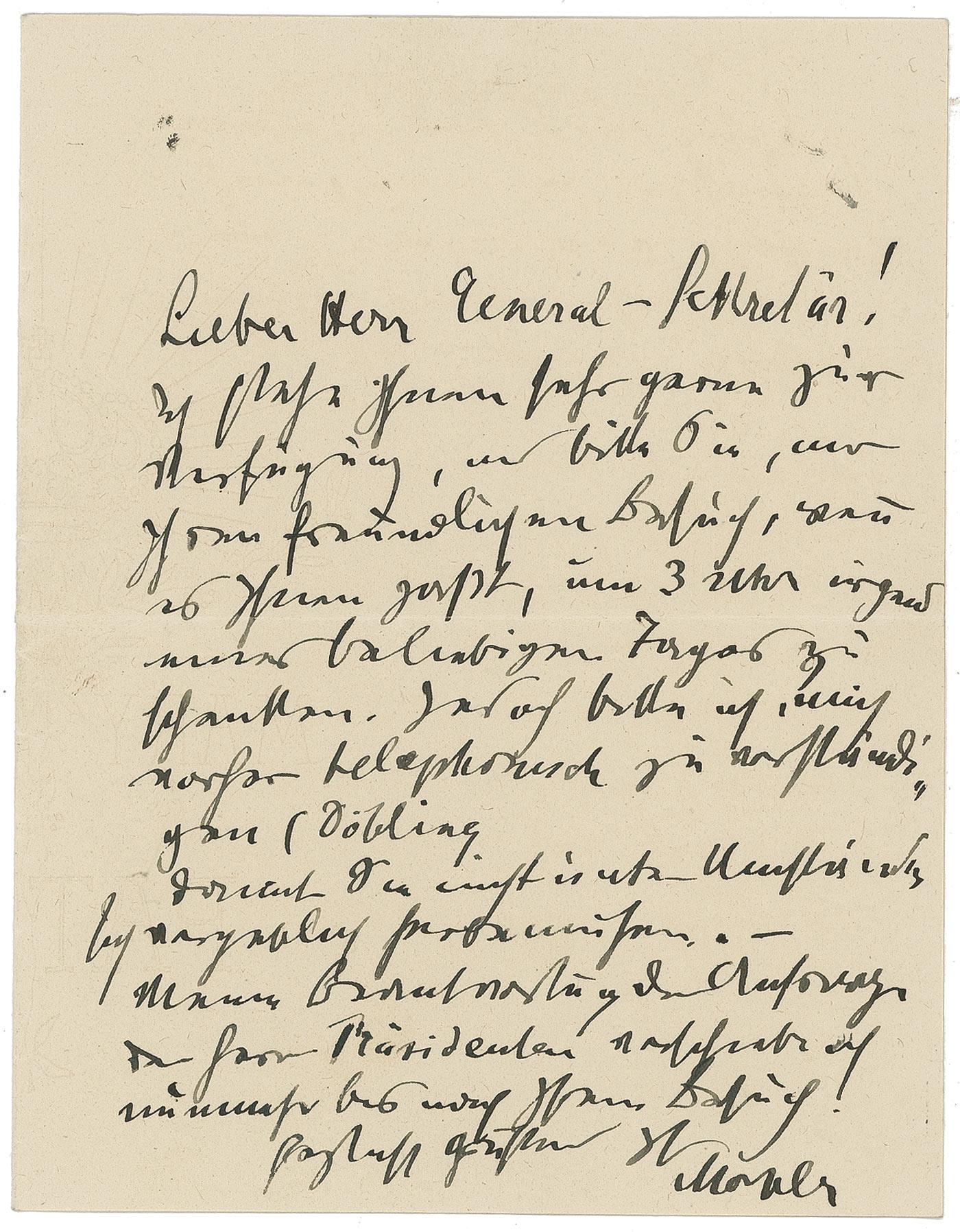 Austrian composer (1860–1911) whose epic symphonies redefined the genre and assured him a place among the most important and influential composers of the late 19th and early 20th centuries. Boldly penned ALS in German, signed “Mahler,” one page, 5.5 x 7, no date. Letter to musicologist Hugo Botstiber (1875-1941). Translated in part: “I shall be happy to be at your disposal and kindly request you to pay your call, if it suits you, at 3 PM of any day you like. However I beg you to contact me before by telephone in Döbling. To avoid that you get in circumstances that you couldn’t see me there. I will wait to answer the request of the President until I see you.” In fine condition, with a central horizontal fold, and a few stray ink marks to top border.