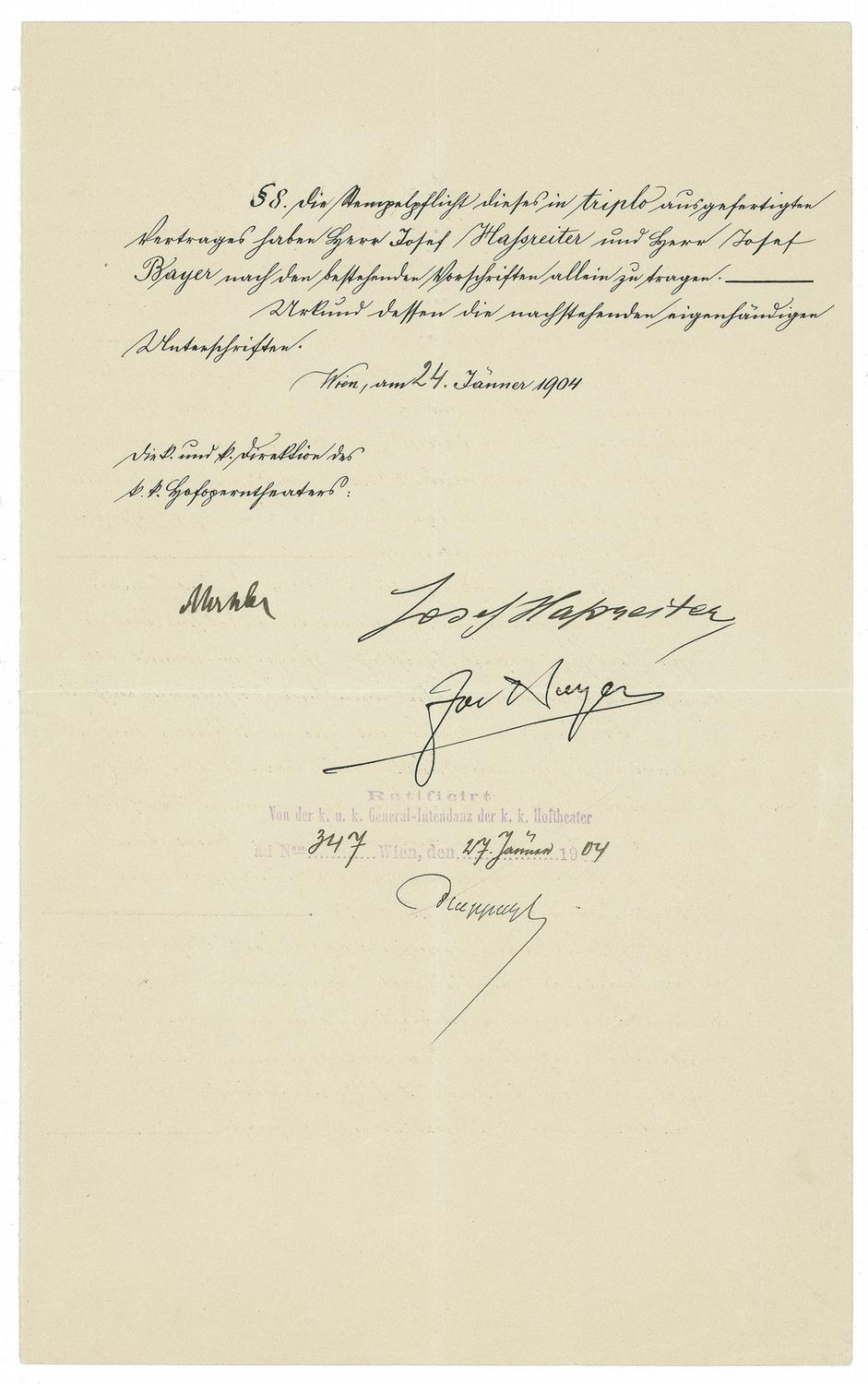 Austrian composer (1860–1911) whose epic symphonies redefined the genre and assured him a place among the most important and influential composers of the late 19th and early 20th centuries. ALS in German, signed “Mahler,” one page, 8.25 x 13.5, January 24, 1904. in full (translated): “In accordance with existing regulations, Mr. Josef Hapsreiter and Mr. Josef Bayer are personably responsible for the total cost of ratification stamps affixed to subject contract, issued in triplicate. Indicating acknowledgment by their individual signatures below.” Central horizontal and vertical folds, a uniform shade of toning, a few creases and wrinkles, and a received stamp to lower blank portion, otherwise fine condition.