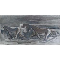 Gustav Rehberger (1910-1995) (New York) Casein on Board. Horses. 19" x 39". signed lower right. Est $3,500 - $4,500.