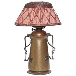 Good Gustav Stickley lamp, model #294, hammered copper base with twisted wrought iron handles holding an original Japanese wicker shade with replaced silk liner, original patina signed 16"dia x 25"h, exellent condition