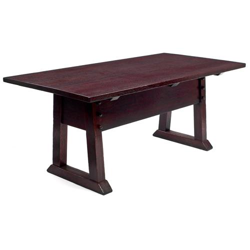 Gustav Stickley Director's table,#631 1/2, rectangular top over splayed legs and a shoefoot base,wide apron and pull peg construction, re finished,72in.w x 36in.d x 30in.h,very good condition