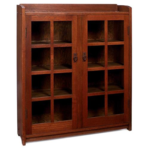 Gustav Stickley bookcase, #717, double door form each with eight panes of glass with original copper hardware, slab sides with thru-tenon construction, original finish, signed with red decal, 48"w x 13"d x 56"h, very good condition