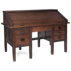 Gustav Stickley desk, #363, roll top form with complete interior over base cabinet consisting of a series of drawers and writing boards, refinished, signed with early red decal, 60”w x 32”d x 43”h, very good condition