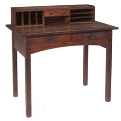 Gustav Stickley desk, similar to #720, two drawers with original copper hardware over an arched rail, back gallery consists of two drawers flanked by letter organizers, pen holders missing, drill hole at back, branded signature some wear to original finish, damage to one leg, holes at side, 38”w x 23”d x 37”h, good condition