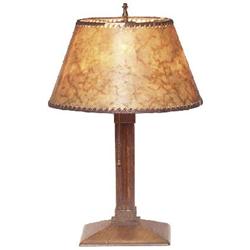 Gustav Stickley lamp, #502, wood base with hammered copper straps and original socket, replaced parchment shade, original finish, 12”dia. X 17”h, very good condition
