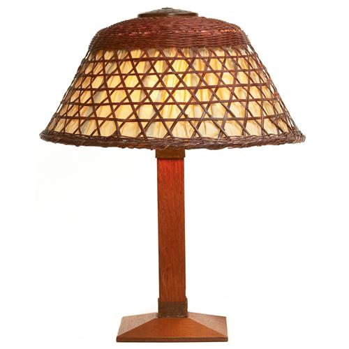 Gustav Stickley lamp,#507, single post with hammered copper trim original Japanese wicker shade, original finish and patina, replaced fitter, unsigned,18in.dia. x 22in.h, excellent condition