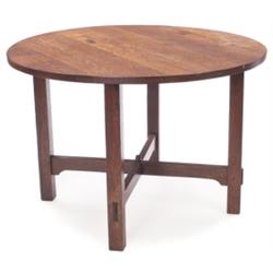 Gustav Stickley table, #668, circular top above a notched thru-tenon cross stretcher base with a central faceted peg, refinished, unsigned, 44”dia. x 29.5”h, very good condition