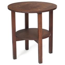 Gustav Stickley tea table, circular top over a lower shelf supported by cross stretchers, signed with red decal and paper label, original finish, minor separation to top, 24”d x 26”h, very good condition