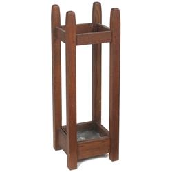 Gustav Stickley umbrella stand, #54, four tapered posts with original copper drip pan, original finish, branded signature, 12”w x 12”d x 34”h, very good condition