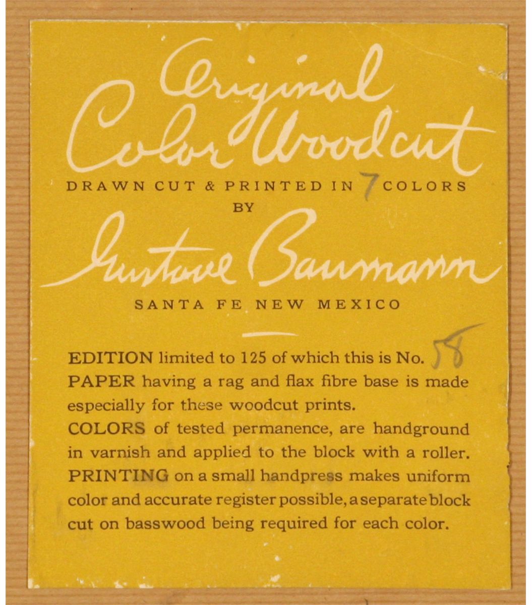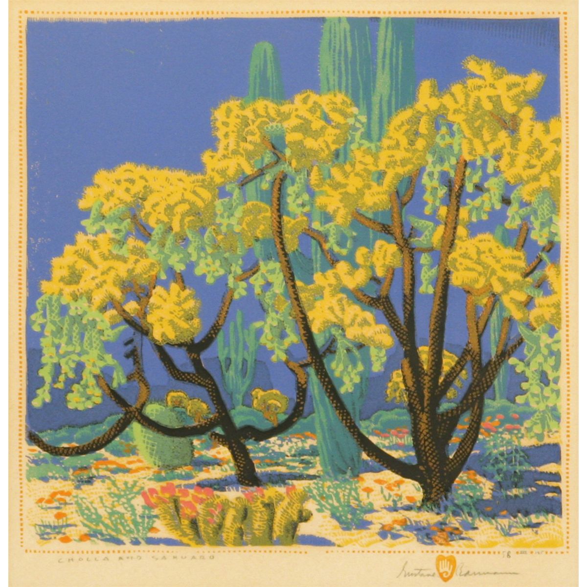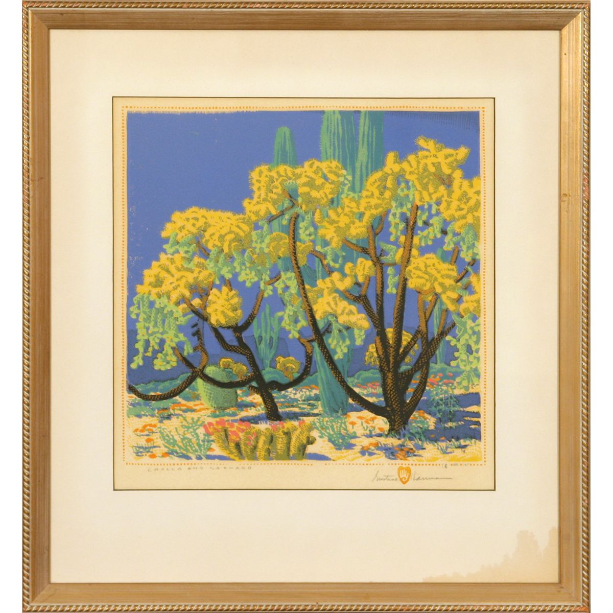 Gustave Baumann (1881 - 1971). Cholla and Saguaro. 12.75" x 12.75" woodblock in seven colors. Pencil inscription in lower margin: CHOLLA AND SAGUARO Gustave Baumann 58 III 125. Artist's label attached verso, circa 1924.