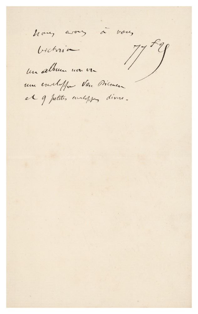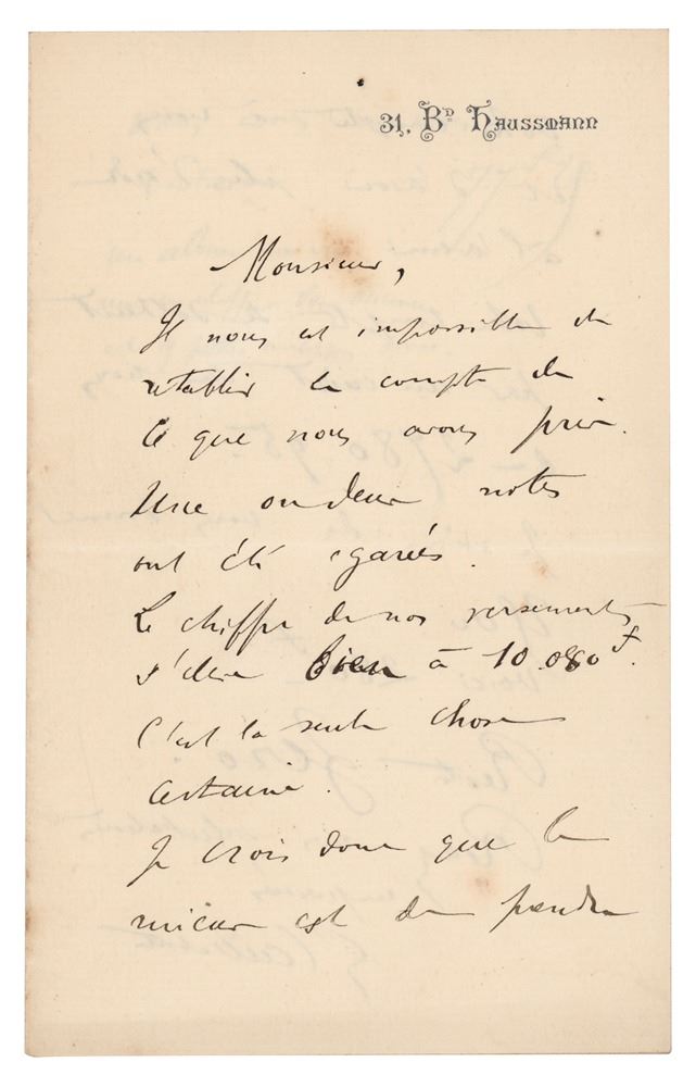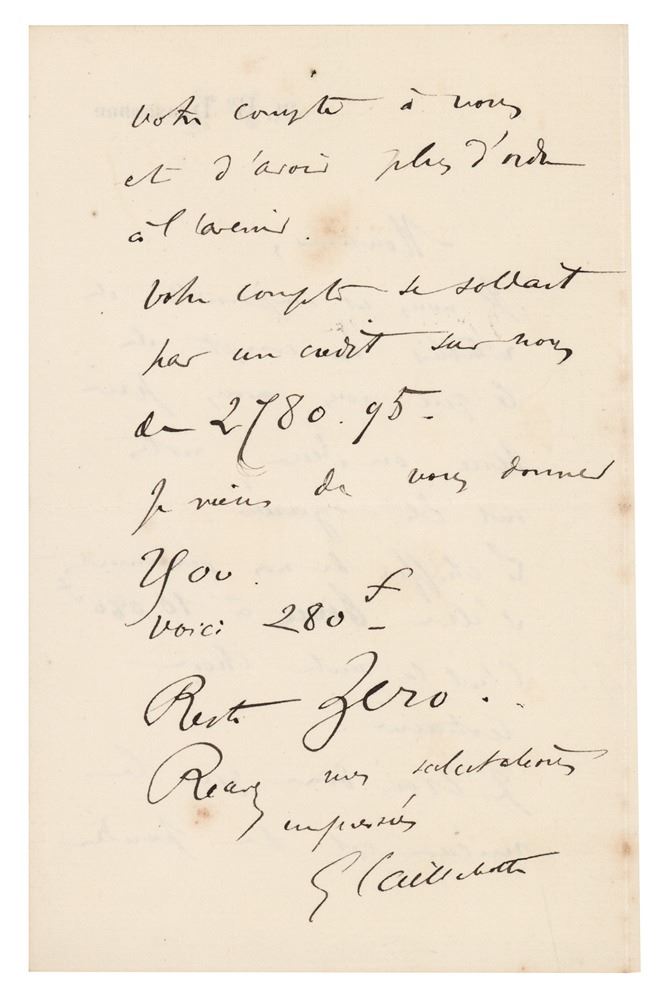 ALS in French, signed "G. Caillebotte," three pages on two adjoining sheets, 3.75 x 6, 31 Bd. Haussmann letterhead, no date. Untranslated handwritten letter by the influential painter to Parisian stamp dealer Pierre Mahé, settling their accounts: he concludes that "Zero" is remaining. In fine condition. Caillebotte lived in a bourgeois residence at 31 Boulevard Haussmann in Paris, and painted the street in many different lights as the days and seasons changed.
